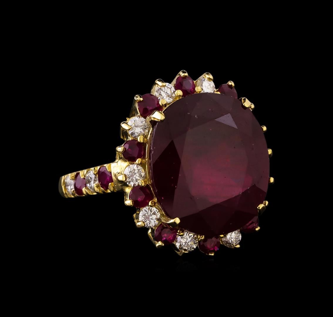 One electronically tested 14KT yellow gold ladies combination cast & assembled ruby and diamond ring with a cathedral shank with a bright polish finish. Identified with markings of "K14". Condition is new. Containing: One prong set oval modified brilliant cut natural ruby, measuring 15.36 x 13.64 x 8.03mm, approximate weight of 14.13ct., clarity is heavily included, type II, medium dark, very slightly brownish, strongly purplish red color, (GIA stpR 6/3), cut is good. Fourteen prong set round modified brilliant cut natural rubies, measuring 2.50 - 2.50 x 1.63 mm, approximate total weight of 1.12ct., clarity is heavily included, type II, medium dark, very slightly brownish, strongly purplish red color, (GIA stpR 6/3), cut is good. Fourteen prong set round brilliant cut diamonds, measuring 2.00 - 2.00 x 1.20mm (depth est.) approximate total weight of 14 Stones = 0.41ct. Clarity: SI-1. Color: I - J, Cut is Good. All diamonds and colored gemstones are graded in the mounting, unless otherwise stated. Colored gemstones are presumed to have been subjected to commonly used enhancement processes. Total Weight of Colored Stones 15.25ct. Total Weight of Diamonds 0.41ct. Total Weight of Ring 9.30 grams. GGL Appraised at $4,910.00.