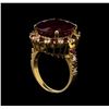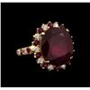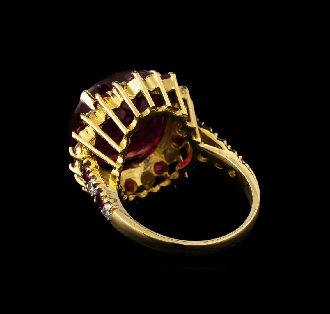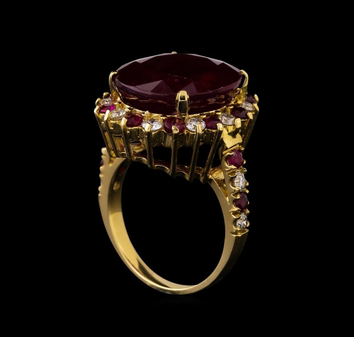 One electronically tested 14KT yellow gold ladies combination cast & assembled ruby and diamond ring with a cathedral shank with a bright polish finish. Identified with markings of "K14". Condition is new. Containing: One prong set oval modified brilliant cut natural ruby, measuring 15.36 x 13.64 x 8.03mm, approximate weight of 14.13ct., clarity is heavily included, type II, medium dark, very slightly brownish, strongly purplish red color, (GIA stpR 6/3), cut is good. Fourteen prong set round modified brilliant cut natural rubies, measuring 2.50 - 2.50 x 1.63 mm, approximate total weight of 1.12ct., clarity is heavily included, type II, medium dark, very slightly brownish, strongly purplish red color, (GIA stpR 6/3), cut is good. Fourteen prong set round brilliant cut diamonds, measuring 2.00 - 2.00 x 1.20mm (depth est.) approximate total weight of 14 Stones = 0.41ct. Clarity: SI-1. Color: I - J, Cut is Good. All diamonds and colored gemstones are graded in the mounting, unless otherwise stated. Colored gemstones are presumed to have been subjected to commonly used enhancement processes. Total Weight of Colored Stones 15.25ct. Total Weight of Diamonds 0.41ct. Total Weight of Ring 9.30 grams. GGL Appraised at $4,910.00.