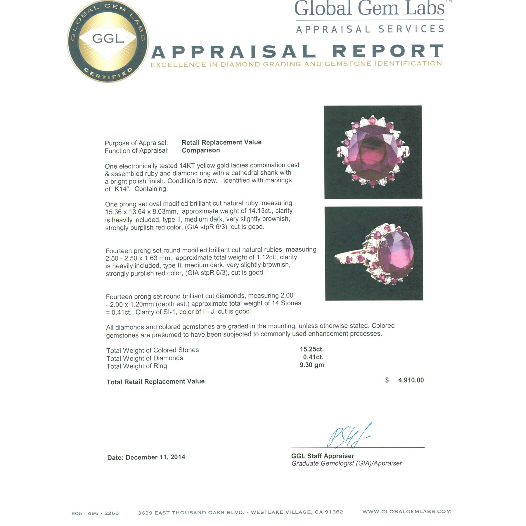 One electronically tested 14KT yellow gold ladies combination cast & assembled ruby and diamond ring with a cathedral shank with a bright polish finish. Identified with markings of "K14". Condition is new. Containing: One prong set oval modified brilliant cut natural ruby, measuring 15.36 x 13.64 x 8.03mm, approximate weight of 14.13ct., clarity is heavily included, type II, medium dark, very slightly brownish, strongly purplish red color, (GIA stpR 6/3), cut is good. Fourteen prong set round modified brilliant cut natural rubies, measuring 2.50 - 2.50 x 1.63 mm, approximate total weight of 1.12ct., clarity is heavily included, type II, medium dark, very slightly brownish, strongly purplish red color, (GIA stpR 6/3), cut is good. Fourteen prong set round brilliant cut diamonds, measuring 2.00 - 2.00 x 1.20mm (depth est.) approximate total weight of 14 Stones = 0.41ct. Clarity: SI-1. Color: I - J, Cut is Good. All diamonds and colored gemstones are graded in the mounting, unless otherwise stated. Colored gemstones are presumed to have been subjected to commonly used enhancement processes. Total Weight of Colored Stones 15.25ct. Total Weight of Diamonds 0.41ct. Total Weight of Ring 9.30 grams. GGL Appraised at $4,910.00.