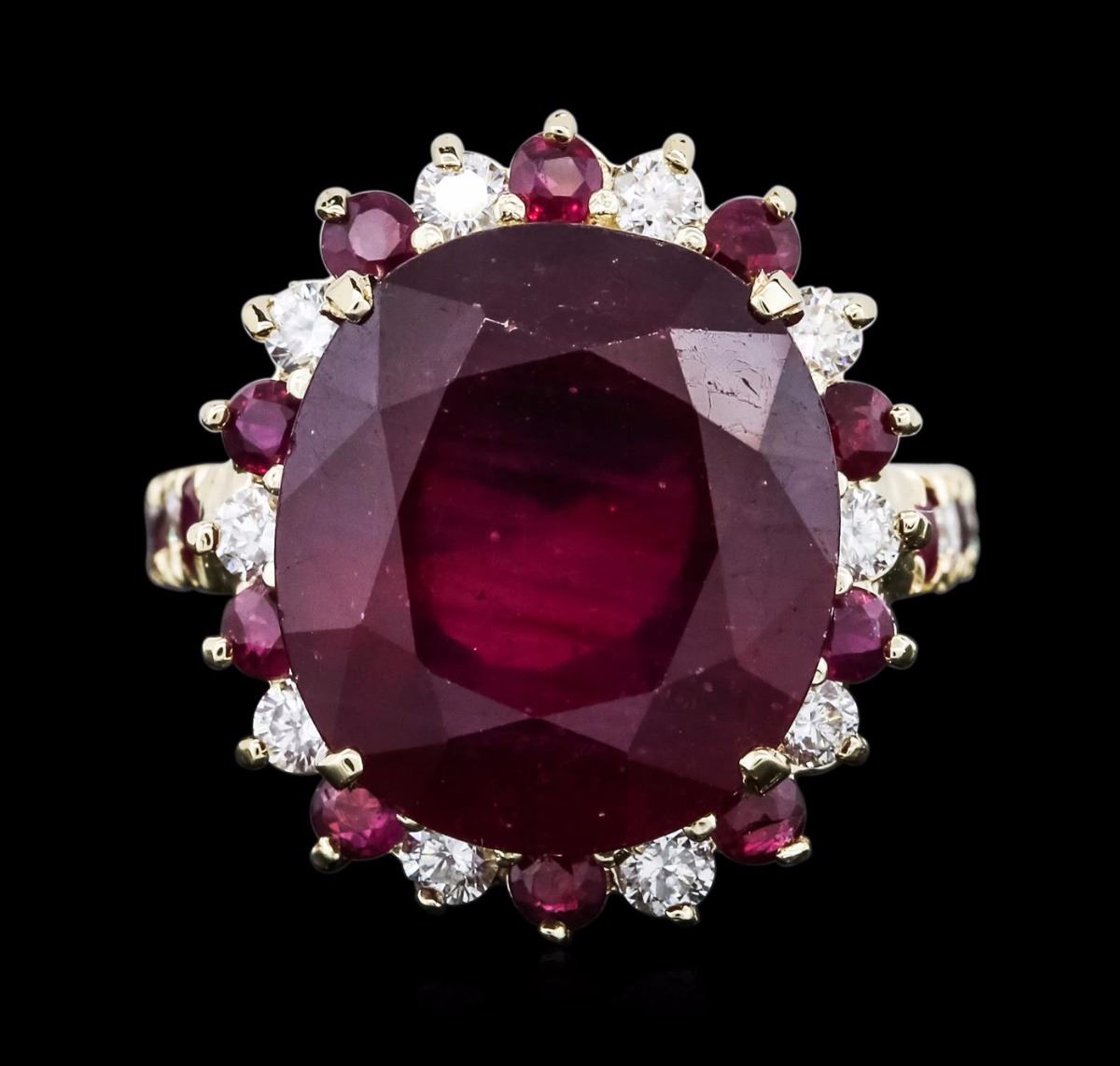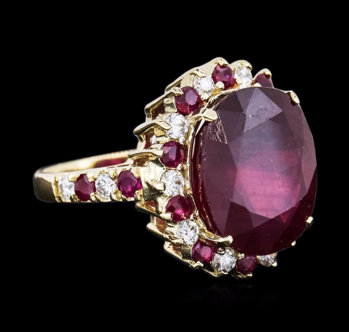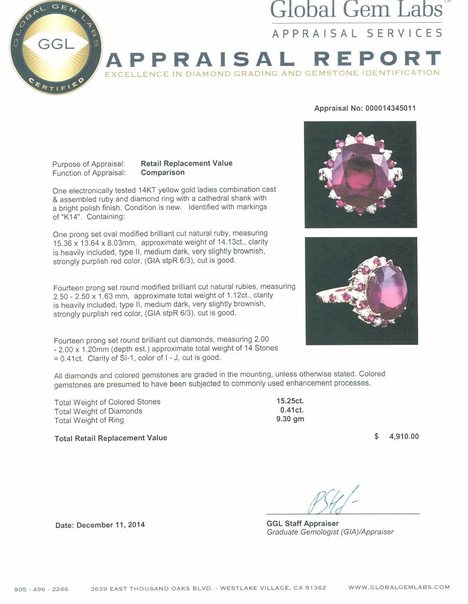 One electronically tested 14KT yellow gold ladies combination cast & assembled ruby and diamond ring with a cathedral shank with a bright polish finish. Identified with markings of "K14". Condition is new. Containing: One prong set oval modified brilliant cut natural ruby, measuring 15.36 x 13.64 x 8.03mm, approximate weight of 14.13ct., clarity is heavily included, type II, medium dark, very slightly brownish, strongly purplish red color, (GIA stpR 6/3), cut is good. Fourteen prong set round modified brilliant cut natural rubies, measuring 2.50 - 2.50 x 1.63 mm, approximate total weight of 1.12ct., clarity is heavily included, type II, medium dark, very slightly brownish, strongly purplish red color, (GIA stpR 6/3), cut is good. Fourteen prong set round brilliant cut diamonds, measuring 2.00 - 2.00 x 1.20mm (depth est.) approximate total weight of 14 Stones = 0.41ct. Clarity: SI-1. Color: I - J, Cut is Good. All diamonds and colored gemstones are graded in the mounting, unless otherwise stated. Colored gemstones are presumed to have been subjected to commonly used enhancement processes. Total Weight of Colored Stones 15.25ct. Total Weight of Diamonds 0.41ct. Total Weight of Ring 9.30 grams. GGL Appraised at $4,910.00.