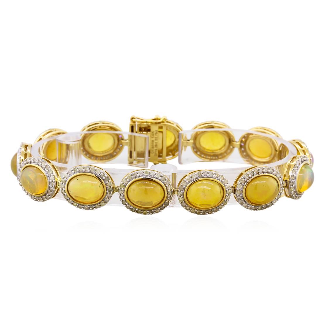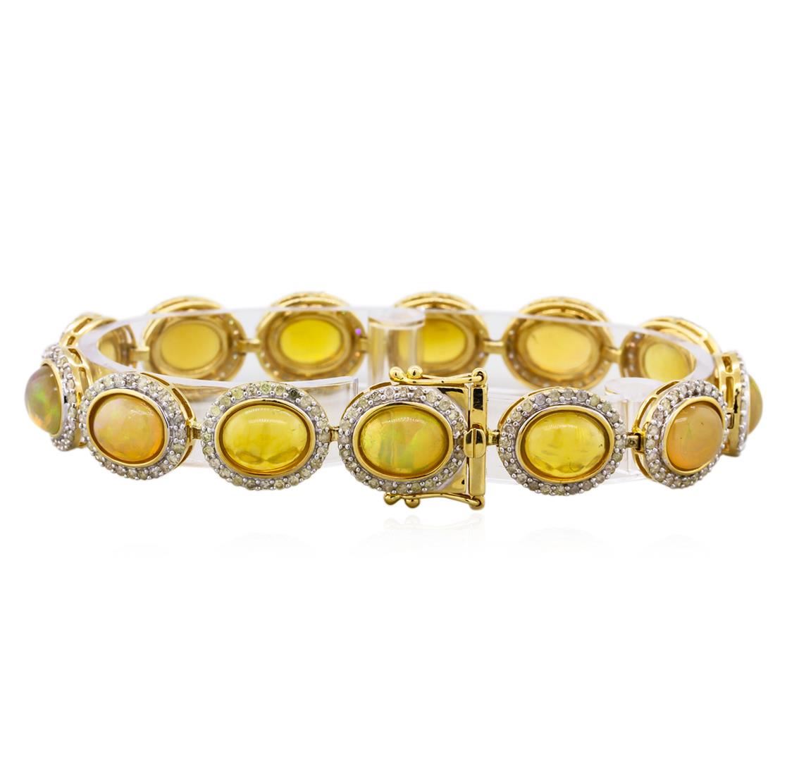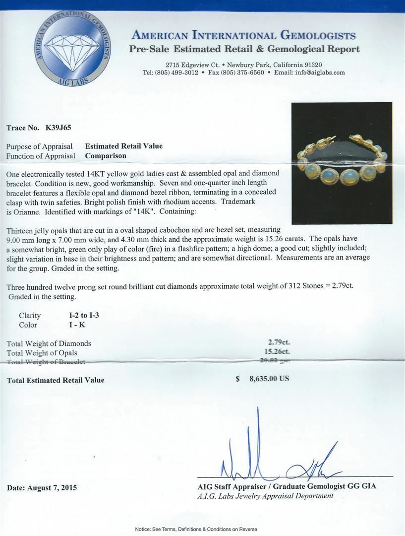One electronically tested 14KT yellow gold ladies cast & assembled opal and diamond bracelet. Seven and one-quarter inch length bracelet features a flexible opal and diamond bezel ribbon, terminating in a concealed clasp with twin safeties. Bright polish finish with rhodium accents. Trademark is Orianne. Identified with markings of "14K". Condition is new, good workmanship. Containing: Thirteen jelly opals that are cut in a oval shaped cabochon and are bezel set, measuring 9.00 mm long x 7.00 mm wide, and 4.30 mm thick and the approximate weight is 15.26 carats. The opals have a somewhat bright, green only play of color (fire) in a flashfire pattern; a high dome; a good cut; slightly included; slight variation in base in their brightness and pattern; and are somewhat directional. Measurements are an average for the group. Graded in the setting. Three Hundred Twelve prong set round brilliant cut diamonds approximate. Total Weight of 312 Stones = 2.79ct. Graded in the setting. Clarity: I-2 to I-3. Color: I - K. Total Weight of Diamonds 2.79ct. Total Weight of Opals 15.26ct. Total Weight of Bracelet 20.82gm. AIG Appraised at $8,635.00.
