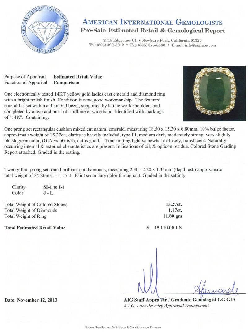 One electronically tested 14KT yellow gold ladies cast emerald and diamond ring with a bright polish finish. Condition is new, good workmanship. The featured emerald is set within a diamond bezel, supported by lattice work shoulders and completed by a two and one-half millimeter wide band. Identified with markings of "14K". Containing: One prong set rectangular cushion mixed cut natural emerald, measuring 18.50 x 15.30 x 6.80mm, 10% bulge factor, approximate weight of 15.27ct., clarity is heavily included, type III, medium dark, moderately strong, very slightly bluish green color, (GIA vslbG 6/4), cut is good. Transmitting light somewhat diffusely, translucent. Naturally occurring internal & external characteristics are present. Indications of oil, & opticon residue. Colored Stone Grading Report attached. Graded in the setting. Twenty-four prong set round brilliant cut diamonds, measuring 2.30 - 2.20 x 1.35mm (depth est.) approximate total weight of 24 Stones = 1.17ct. Faint secondary color throughout. Graded in the setting. Clarity SI-1 to I-1. Color J -- L. Total Weight of Colored Stones 15.27ct. Total Weight of Diamonds 1.17ct. Total Weight of Ring 11.80gm. AIG Appraised.