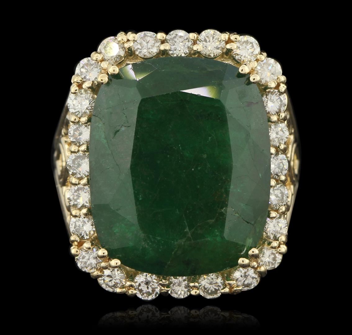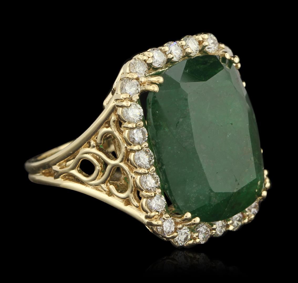 One electronically tested 14KT yellow gold ladies cast emerald and diamond ring with a bright polish finish. Condition is new, good workmanship. The featured emerald is set within a diamond bezel, supported by lattice work shoulders and completed by a two and one-half millimeter wide band. Identified with markings of "14K". Containing: One prong set rectangular cushion mixed cut natural emerald, measuring 18.50 x 15.30 x 6.80mm, 10% bulge factor, approximate weight of 15.27ct., clarity is heavily included, type III, medium dark, moderately strong, very slightly bluish green color, (GIA vslbG 6/4), cut is good. Transmitting light somewhat diffusely, translucent. Naturally occurring internal & external characteristics are present. Indications of oil, & opticon residue. Colored Stone Grading Report attached. Graded in the setting. Twenty-four prong set round brilliant cut diamonds, measuring 2.30 - 2.20 x 1.35mm (depth est.) approximate total weight of 24 Stones = 1.17ct. Faint secondary color throughout. Graded in the setting. Clarity SI-1 to I-1. Color J -- L. Total Weight of Colored Stones 15.27ct. Total Weight of Diamonds 1.17ct. Total Weight of Ring 11.80gm. AIG Appraised at $15,110.00.
