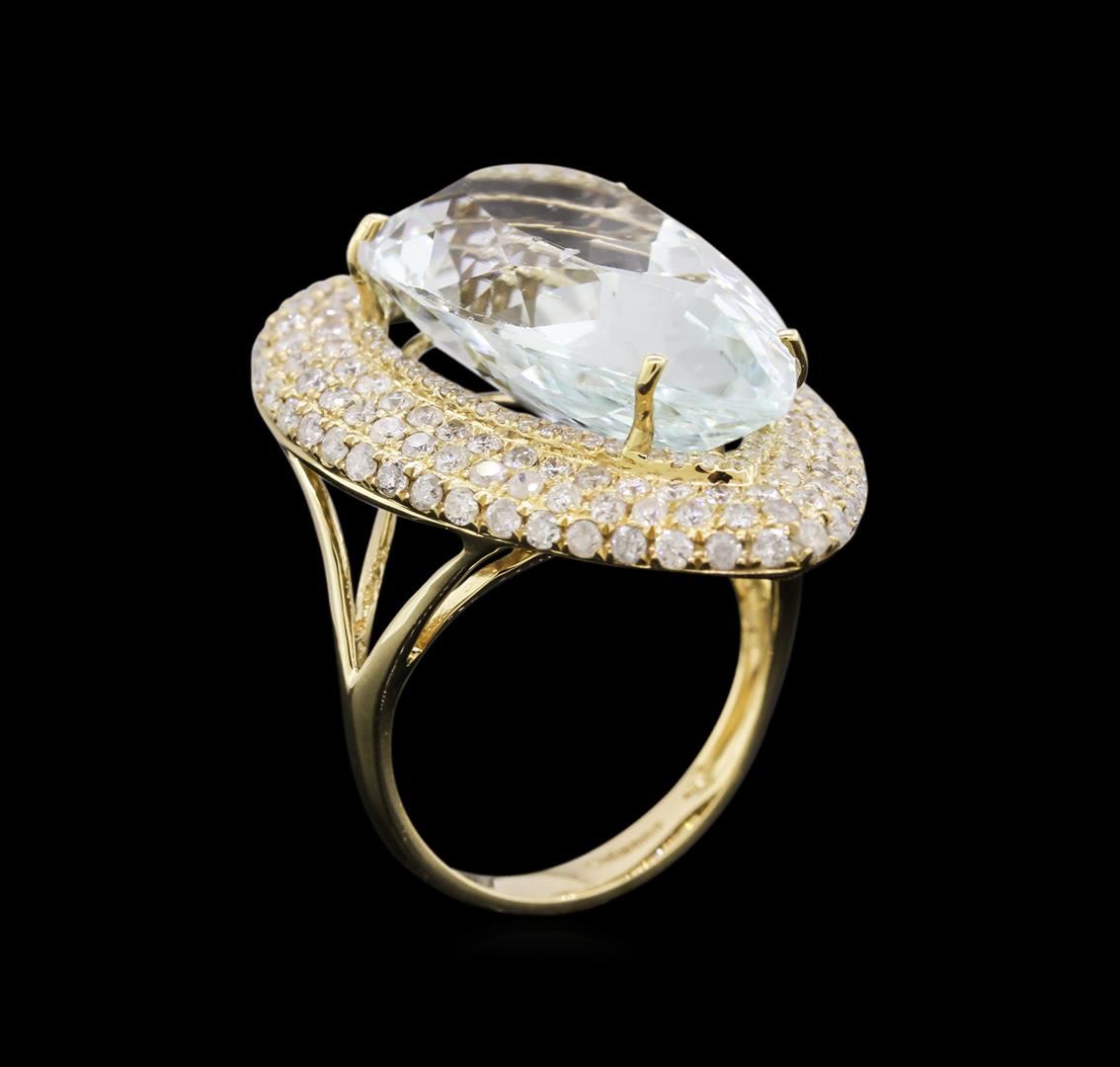 One electronically tested 14KT yellow gold Ladies combination cast & assembled ring with a bright polish finish. Condition is new. Identified with markings of "14K". Containing: One prong set pear modified brilliant cut natural aquamarine, measuring 23.59 x 13.86 x 8.95mm, exact weight 15.52ct., clarity is eye clean, type I, light, very slightly grayish, very slightly greenish blue color, (GIA vslgB 3/3), cut is good. GIA Report: 1156952840.One Hundred Thirty-Two prong set round brilliant cut diamonds, measuring 1.30 - 1.30 x 0.78mm (depth est.) approximate. Total Weight of 132 Stones = 1.55ct. Clarity: I-2 to I-3. Color: I - J, Cut is Good. Forty-Nine prong set round brilliant cut diamonds, measuring 1.00 - 1.00 x 0.60mm (depth est.) approximate. Total Weight of 49 Stones = 0.17ct. Clarity: I-2 to I-3. Color: I - J, Cut is Good. Total Weight of Colored Stones 15.52ct. Total Weight of Diamonds 1.72ct. Total Weight of Ring 9.50 grams. GGL Appraised at $22,180.00.