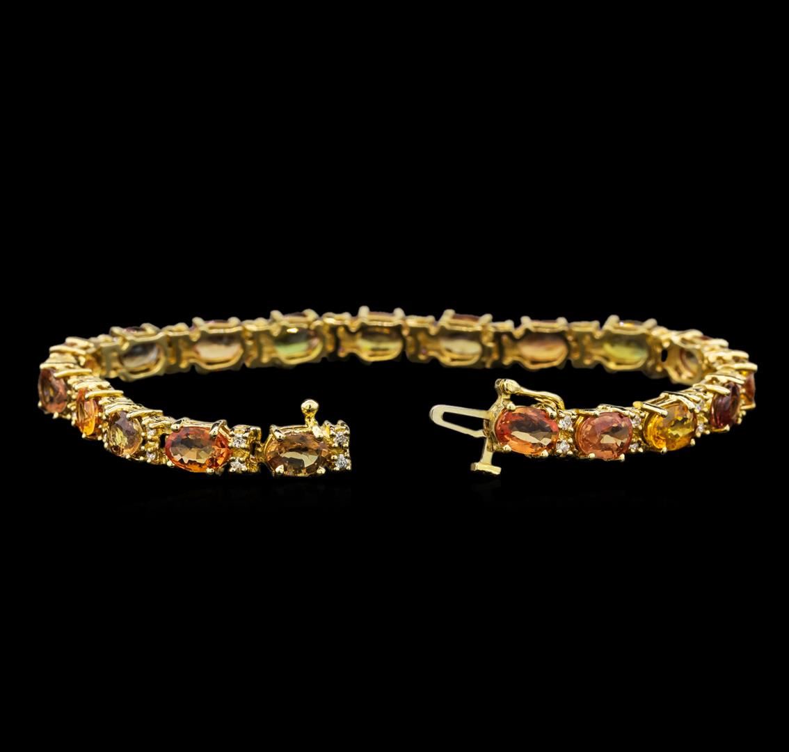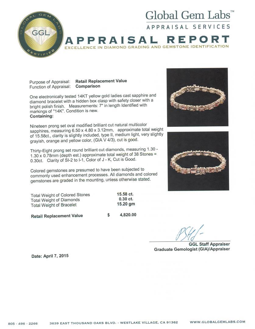 One electronically tested 14KT yellow gold ladies cast sapphire and diamond bracelet with a hidden box clasp with safety closer with a bright polish finish. Measurements: 7" in length Identified with markings of "14K". Condition is new. Containing: Nineteen prong set oval modified brilliant cut natural multicolor sapphires, measuring 6.50 x 4.80 x 3.12mm, approximate total weight of 15.58ct., clarity is slightly included, type II, medium light, very slightly grayish, orange and yellow color, (GIA V 4/3), cut is good. Thirty-Eight prong set round brilliant cut diamonds, measuring 1.30 - 1.30 x 0.78mm (depth est.) approximate total weight of 38 Stones = 0.30ct. Clarity: SI-2 to I-1. Color: J - K, Cut is Good. Colored gemstones are presumed to have been subjected to commonly used enhancement processes. All diamonds and colored gemstones are graded in the mounting, unless otherwise stated. Total Weight of Colored Stones 15.58ct. Total Weight of Diamonds 0.30ct. Total Weight of Bracelet 15.20 grams. GGL Appraised at $4,820.00.