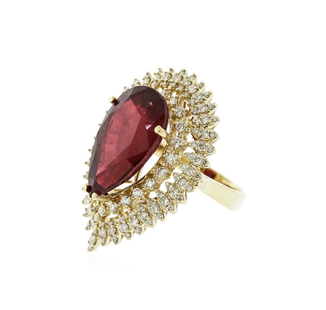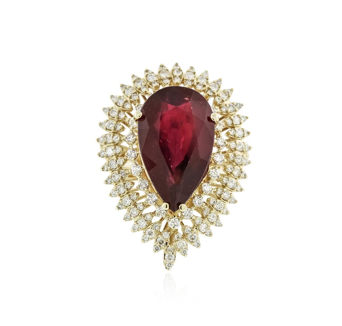 One electronically tested 14KT yellow gold ladies cast ruby and diamond ring with a bright polish finish. Identified with markings of "14K". Condition is new. Containing: One prong set pear modified brilliant cut natural ruby, measuring 21.00 x 12.00 x 7.80mm, approximate weight of 15.72ct., clarity is heavily included, type II, medium dark, slightly brownish, strongly purplish red color, (GIA stpR 6/2), cut is good. One Hundred Twenty-Nine prong set round brilliant cut diamonds, measuring 1.30 - 1.20 x 0.75mm (depth est.) approximate total weight of 129 Stones = 0.92ct.. Clarity: SI-1 to SI-2. Color: I - J, Cut is Good. Colored gemstones are presumed to have been subjected to commonly used enhancement processes. All diamonds and colored gemstones are graded in the mounting, unless otherwise stated.. Total Weight of Colored Stones 15.72ct.. Total Weight of Diamonds 0.92ct.. Total Weight of Ring 15.70 grams. GGL Appraised at $7,040.00.