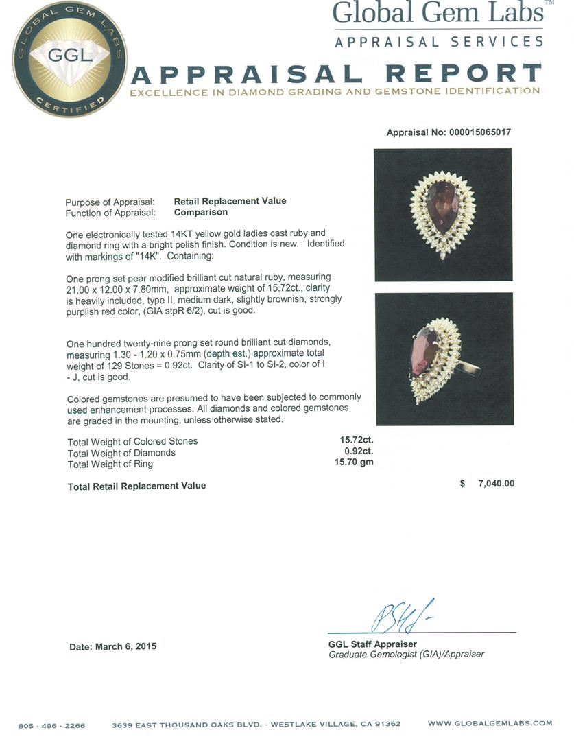 One electronically tested 14KT yellow gold ladies cast ruby and diamond ring with a bright polish finish. Identified with markings of "14K". Condition is new. Containing: One prong set pear modified brilliant cut natural ruby, measuring 21.00 x 12.00 x 7.80mm, approximate weight of 15.72ct., clarity is heavily included, type II, medium dark, slightly brownish, strongly purplish red color, (GIA stpR 6/2), cut is good. One Hundred Twenty-Nine prong set round brilliant cut diamonds, measuring 1.30 - 1.20 x 0.75mm (depth est.) approximate total weight of 129 Stones = 0.92ct.. Clarity: SI-1 to SI-2. Color: I - J, Cut is Good. Colored gemstones are presumed to have been subjected to commonly used enhancement processes. All diamonds and colored gemstones are graded in the mounting, unless otherwise stated.. Total Weight of Colored Stones 15.72ct.. Total Weight of Diamonds 0.92ct.. Total Weight of Ring 15.70 grams. GGL Appraised at $7,040.00.