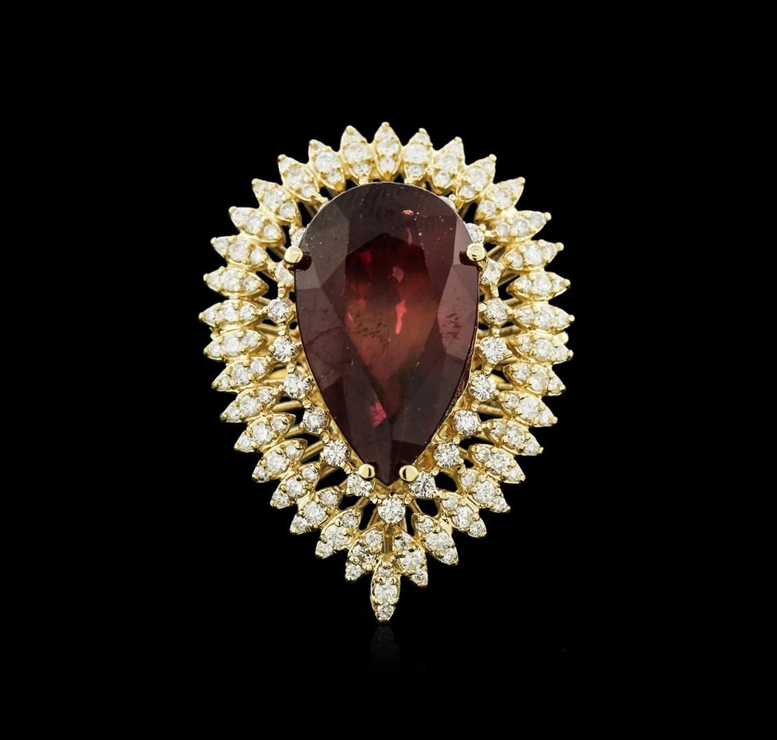 One electronically tested 14KT yellow gold ladies cast ruby and diamond ring with a bright polish finish. Identified with markings of "14K". Condition is new. Containing: One prong set pear modified brilliant cut natural ruby, measuring 21.00 x 12.00 x 7.80mm, approximate weight of 15.72ct., clarity is heavily included, type II, medium dark, slightly brownish, strongly purplish red color, (GIA stpR 6/2), cut is good. One Hundred Twenty-Nine prong set round brilliant cut diamonds, measuring 1.30 - 1.20 x 0.75mm (depth est.) approximate total weight of 129 Stones = 0.92ct.. Clarity: SI-1 to SI-2. Color: I - J, Cut is Good. Colored gemstones are presumed to have been subjected to commonly used enhancement processes. All diamonds and colored gemstones are graded in the mounting, unless otherwise stated.. Total Weight of Colored Stones 15.72ct.. Total Weight of Diamonds 0.92ct.. Total Weight of Ring 15.70 grams. GGL Appraised at $7,040.00.