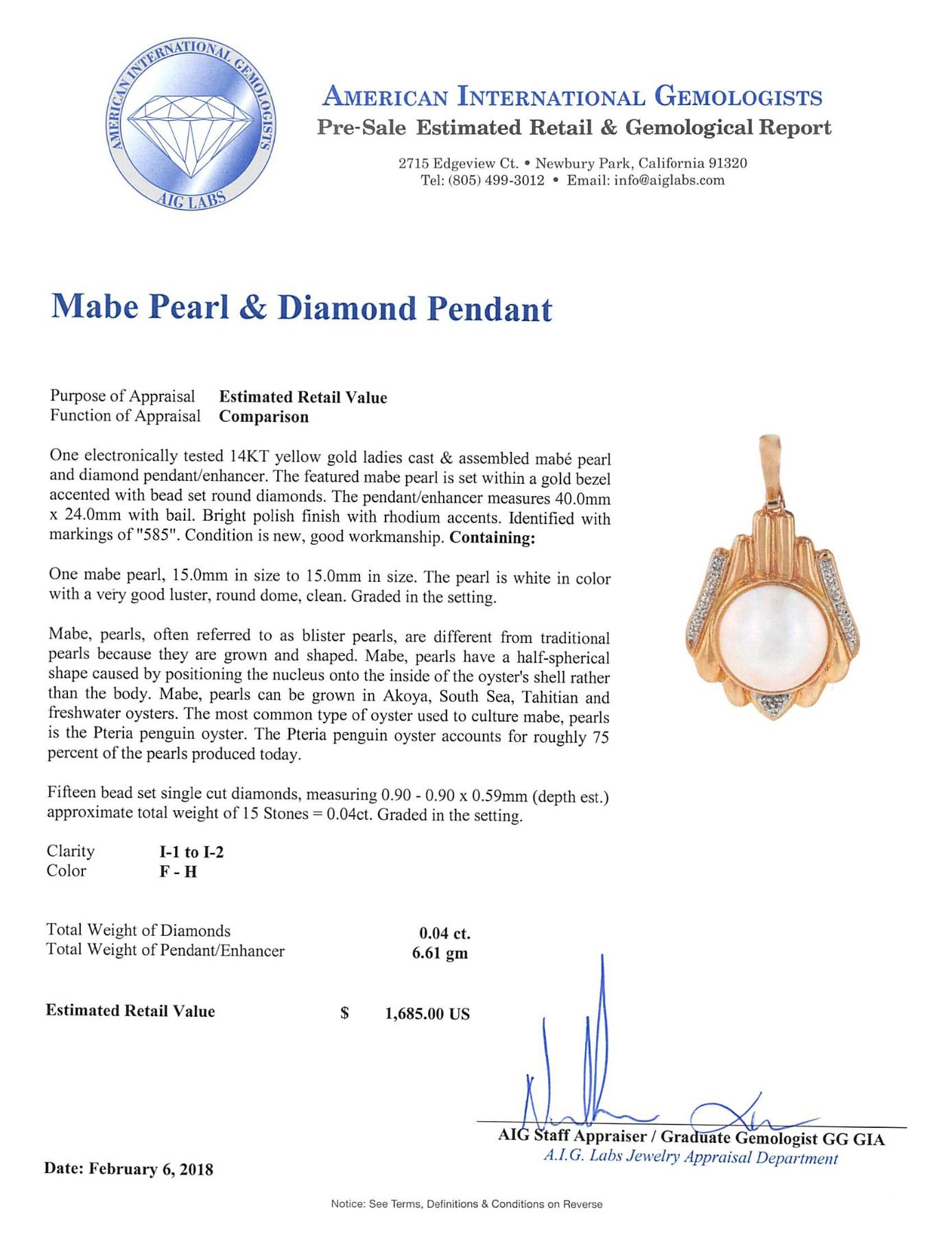 One 14KT Yellow Gold 15mm Pearl and Diamond Ring. One electronically tested 14KT yellow gold ladies cast & assembled mab‚ pearl and diamond pendant/enhancer. The featured mabe pearl is set within a gold bezel accented with bead set round diamonds. The pendant/enhancer measures 40.0mm x 24.0mm with bail. Bright polish finish with rhodium accents. Identified with markings of "585". Condition is new, good workmanship. Containing: One mabe pearl, 15.0mm in size to 15.0mm in size. The pearl is white in color with a very good luster, round dome, clean Graded in the setting. Mab, pearls, often referred to as blister pearls, are different from traditional pearls because they are grown and shaped. Mab, pearls have a half-spherical shape caused by positioning the nucleus onto the inside of the oyster's shell rather than the body. Mab, pearls can be grown in Akoya, South Sea, Tahitian and freshwater oysters. The most common type of oyster used to culture mab, pearls is the Pteria penguin oyster. The Pteria penguin oyster accounts for roughly 75 percent of the pearls produced today.. Fifteen bead set single cut diamonds, measuring 0.90 - 0.90 x 0.59mm (depth est.) approximate total weight of 15 Stones = 0.04ct. Graded in the setting. Clarity of I-1 to I-2. Color of F - H. Total Weight of Diamonds 0.04 ct. Total Weight of Pendant/Enhancer 6.61 gm.