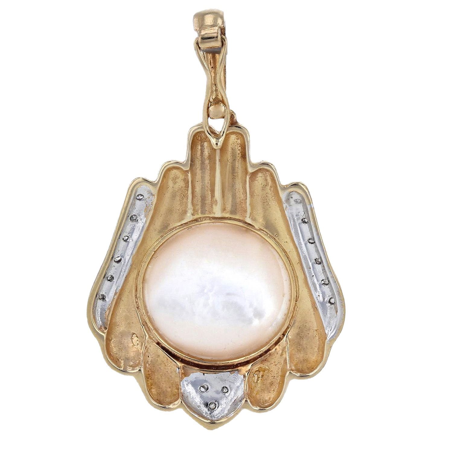 One 14KT Yellow Gold 15mm Pearl and Diamond Ring. One electronically tested 14KT yellow gold ladies cast & assembled mab‚ pearl and diamond pendant/enhancer. The featured mabe pearl is set within a gold bezel accented with bead set round diamonds. The pendant/enhancer measures 40.0mm x 24.0mm with bail. Bright polish finish with rhodium accents. Identified with markings of "585". Condition is new, good workmanship. Containing: One mabe pearl, 15.0mm in size to 15.0mm in size. The pearl is white in color with a very good luster, round dome, clean Graded in the setting. Mab, pearls, often referred to as blister pearls, are different from traditional pearls because they are grown and shaped. Mab, pearls have a half-spherical shape caused by positioning the nucleus onto the inside of the oyster's shell rather than the body. Mab, pearls can be grown in Akoya, South Sea, Tahitian and freshwater oysters. The most common type of oyster used to culture mab, pearls is the Pteria penguin oyster. The Pteria penguin oyster accounts for roughly 75 percent of the pearls produced today.. Fifteen bead set single cut diamonds, measuring 0.90 - 0.90 x 0.59mm (depth est.) approximate total weight of 15 Stones = 0.04ct. Graded in the setting. Clarity of I-1 to I-2. Color of F - H. Total Weight of Diamonds 0.04 ct. Total Weight of Pendant/Enhancer 6.61 gm.