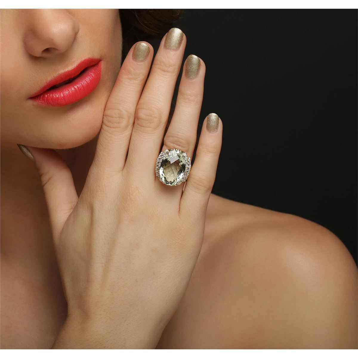 One electronically tested 14KT yellow gold ladies cast green quartz and diamond ring with a bright polish finish. The featured green quartz is set within mirroring diamond set tiers supported by tapering shoulders, completed by a two and one half millimeter wide band. Identified with markings of "14K". Condition is new, good workmanship. Containing: One prong set oval mixed cut natural green quartz, measuring 19.90 x 14.00 x 10.30mm, approximate weight of 16.00ct., clarity is eye clean, medium light, slightly grayish, slightly yellowish green color, (GIA slyG 4/2), cut is good. Transmitting light with no distortion, transparent. Colored Stone Grading Report attached. Graded in the setting. Thirty-Two prong set round brilliant cut diamonds, measuring 1.80 - 1.75 x 1.07mm (depth est.) approximate total weight of 32 Stones = 0.75ct. Graded in the setting. Clarity: VS-2 to SI-2. Color: F - H. Total Weight of Colored Stones 16.00ct. Total Weight of Diamonds 0.75ct. Total Weight of Ring 10.93 grams. AIG Appraised at $4,765.00.
