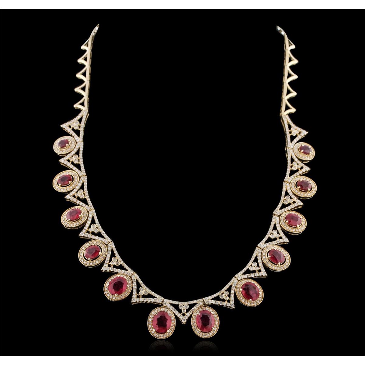 One electronically tested 14KT yellow gold ladies cast & assembled ruby and diamond necklace. Sixteen and one-half inch wearable length necklace features a ruby and diamond set fringe supported by matching white gold links, terminating in a concealed clasp with twin safeties. Bright polish finish. Trademark is Orianne. Identified with markings of "14K". Condition is new, good workmanship. Containing: Twelve prong set oval mixed cut natural rubies approximate total weight of 16.12ct., clarity is heavily included, type II, medium dark, very slightly brownish, slightly purplish red color, (GIA slpR 6/3), cut is good. Transmitting light somewhat diffusely, transparent to translucent. Naturally occurring internal & external characteristics are present. Indications of laboratory high temperature heat treatment, with glass & flux additives. The color grade is an average for the group. Graded in the setting. Ruby has a low tolerance to rhodium plating, repolishing the surface, & ultrasonic cleaning. Six Hundred Fifty-One prong and bezel set round brilliant cut diamonds, measuring 1.60 - 1.20 x 0.84mm (depth est.) approximate total weight of 651 Stones = 7.03ct. Graded in the setting. Clarity: I-1 to I-2. Color: H - J. Total Weight of Colored Stones 16.12ct. Total Weight of Diamonds 7.03ct. Total Weight of Necklace 51.32 grams. AIG Appraised at $29,535.00.