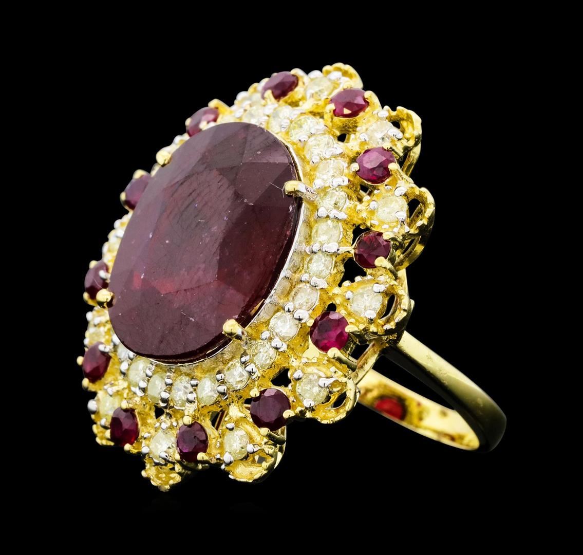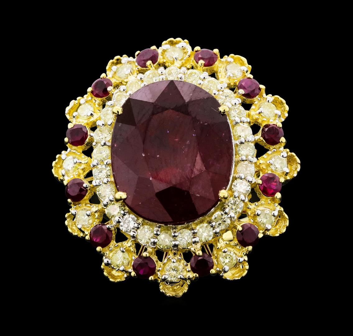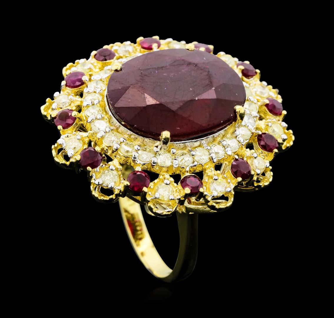 Fourteen karat (14K) yellow gold ruby and diamond ring. One (1) oval and twelve (12) round cut ruby corundum gemstones are prong mounted in the center of the ring. Round brilliant cut diamonds accent the ring around the center gemstones. The ring is cast stamped "14K" and has a gross weight of 12.4 Grams. (13) rubies with a total weight of 16.15cts. (37) diamonds with a total weight of 1.33cts. GA Appraised.