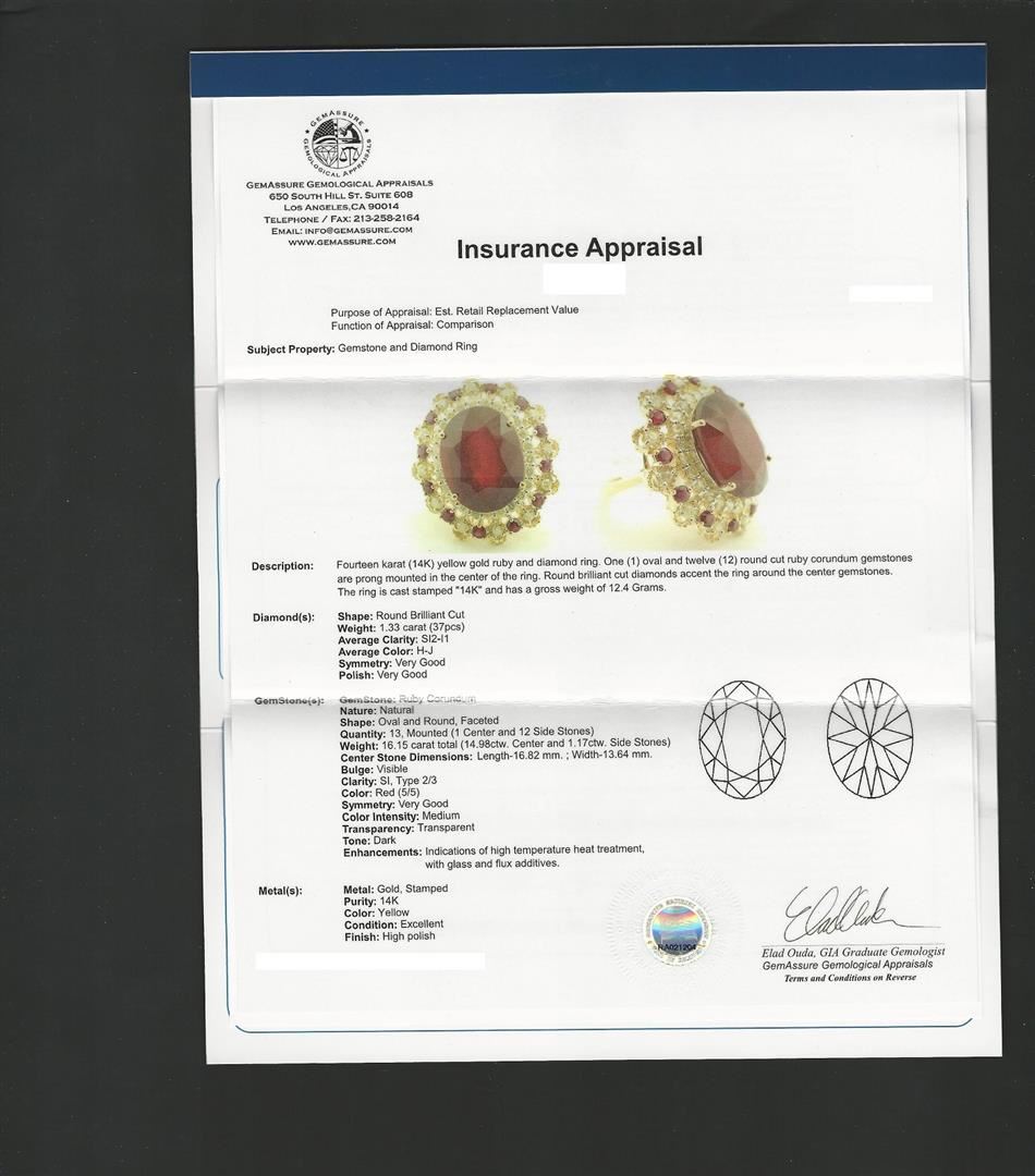 Fourteen karat (14K) yellow gold ruby and diamond ring. One (1) oval and twelve (12) round cut ruby corundum gemstones are prong mounted in the center of the ring. Round brilliant cut diamonds accent the ring around the center gemstones. The ring is cast stamped "14K" and has a gross weight of 12.4 Grams. (13) rubies with a total weight of 16.15cts. (37) diamonds with a total weight of 1.33cts. GA Appraised.