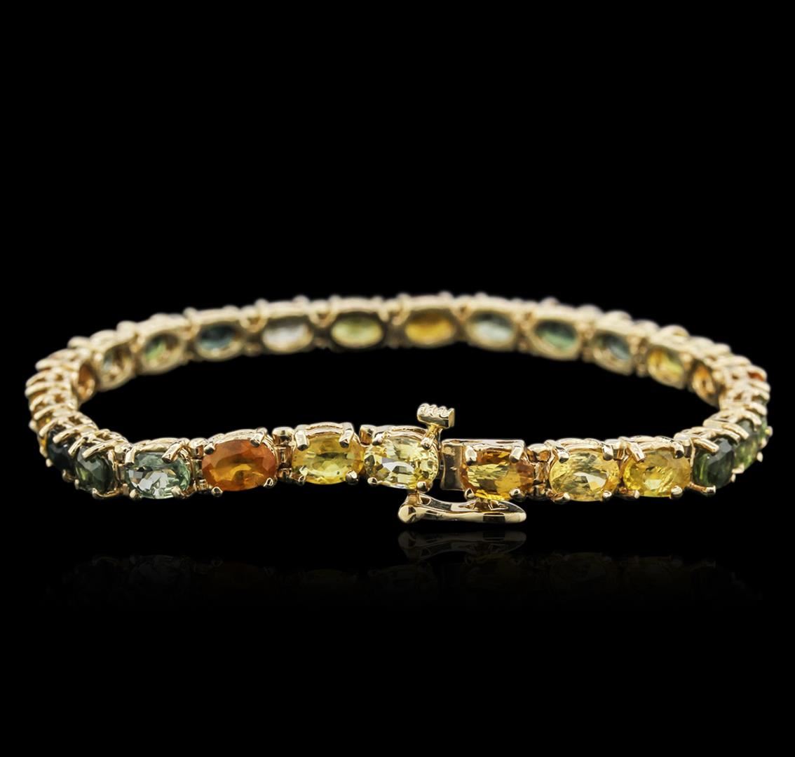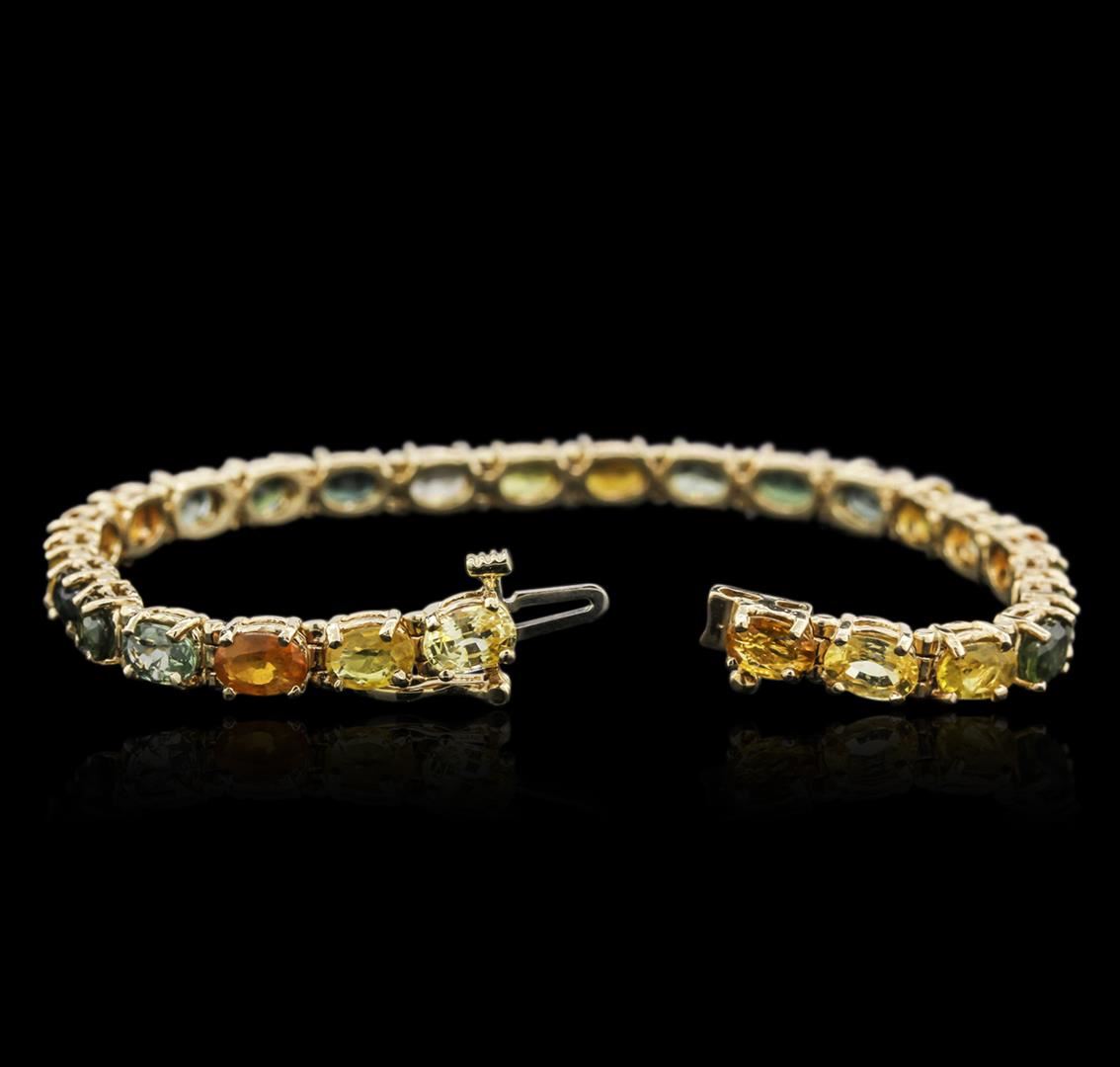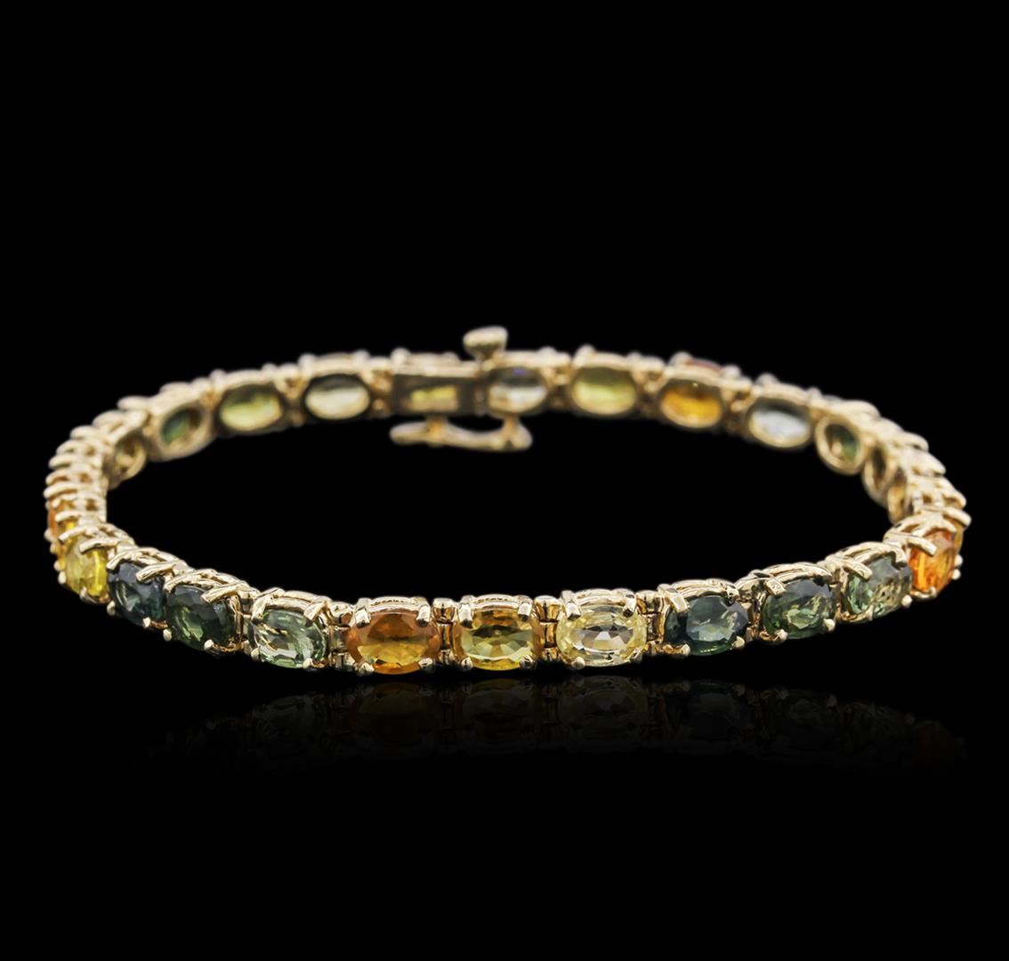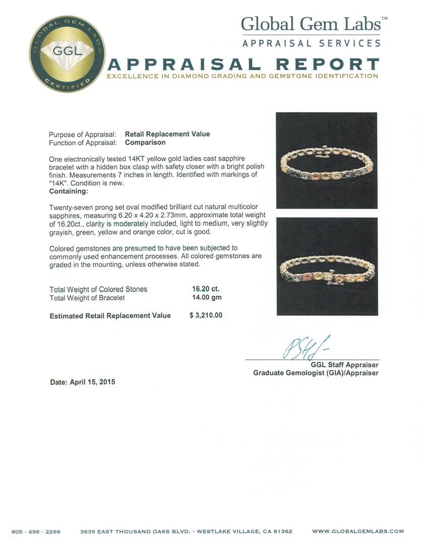One electronically tested 14KT yellow gold ladies cast sapphire bracelet with a hidden box clasp with safety closer with a bright polish finish. Measurements: 7 inches in length. Identified with markings of "14K". Condition is new. Containing: Twenty-seven prong set oval modified brilliant cut natural multicolor sapphires, measuring 6.20 x 4.20 x 2.73mm, approximate total weight of 16.20ct., clarity is moderately included, very light, very slightly grayish, green, yellow and orange color, (GIA bV 2/3), cut is good. Colored gemstones are presumed to have been subjected to commonly used enhancement processes. All colored gemstones are graded in the mounting, unless otherwise stated. Total Weight of Colored Stones 16.20ct. Total Weight of Bracelet 14.00. grams. GGL Appraised at $3,210.00.