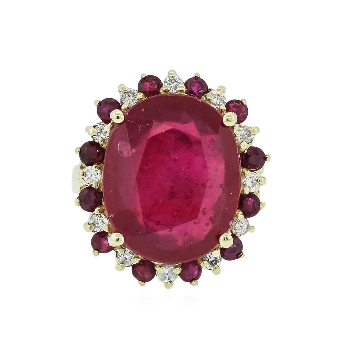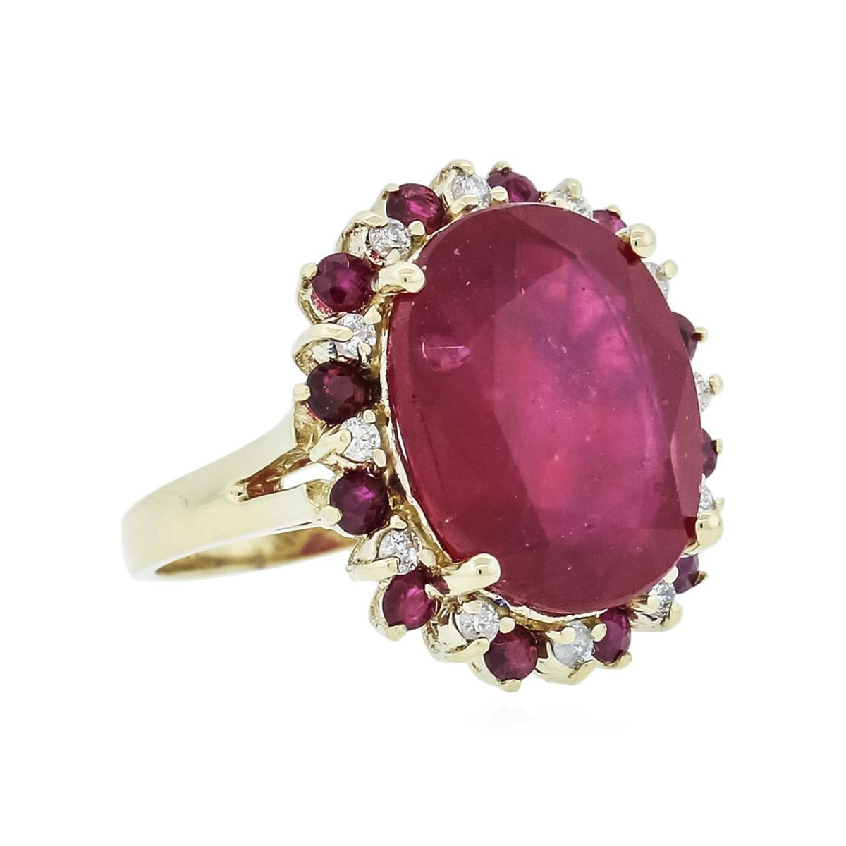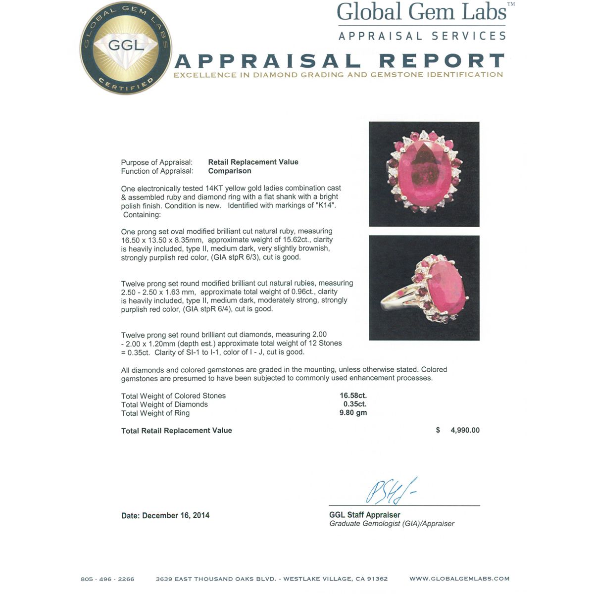 One electronically tested 14KT yellow gold ladies combination cast & assembled ruby and diamond ring with a flat shank with a bright polish finish. Identified with markings of "K14". Condition is new. Containing: One prong set oval modified brilliant cut natural ruby, measuring 16.50 x 13.50 x 8.35mm, approximate weight of 15.62ct., clarity is heavily included, type II, medium dark, very slightly brownish, strongly purplish red color, (GIA stpR 6/3), cut is good. Twelve prong set round modified brilliant cut natural rubies, measuring 2.50 - 2.50 x 1.63 mm, approximate total weight of 0.96ct., clarity is heavily included, type II, medium dark, moderately strong, strongly purplish red color, (GIA stpR 6/4), cut is good. Twelve prong set round brilliant cut diamonds, measuring 2.00 - 2.00 x 1.20mm (depth est.) approximate total weight of 12 Stones = 0.35ct. Clarity: SI-1 to I-1. Color: I - J, Cut is Good. All diamonds and colored gemstones are graded in the mounting, unless otherwise stated. Colored gemstones are presumed to have been subjected to commonly used enhancement processes.. Total Weight of Colored Stones 16.58ct. Total Weight of Diamonds 0.35ct. Total Weight of Ring 9.80 grams. GGL Appraised at $4,990.00.