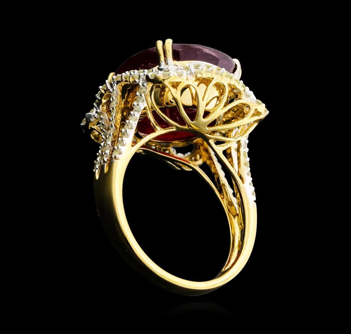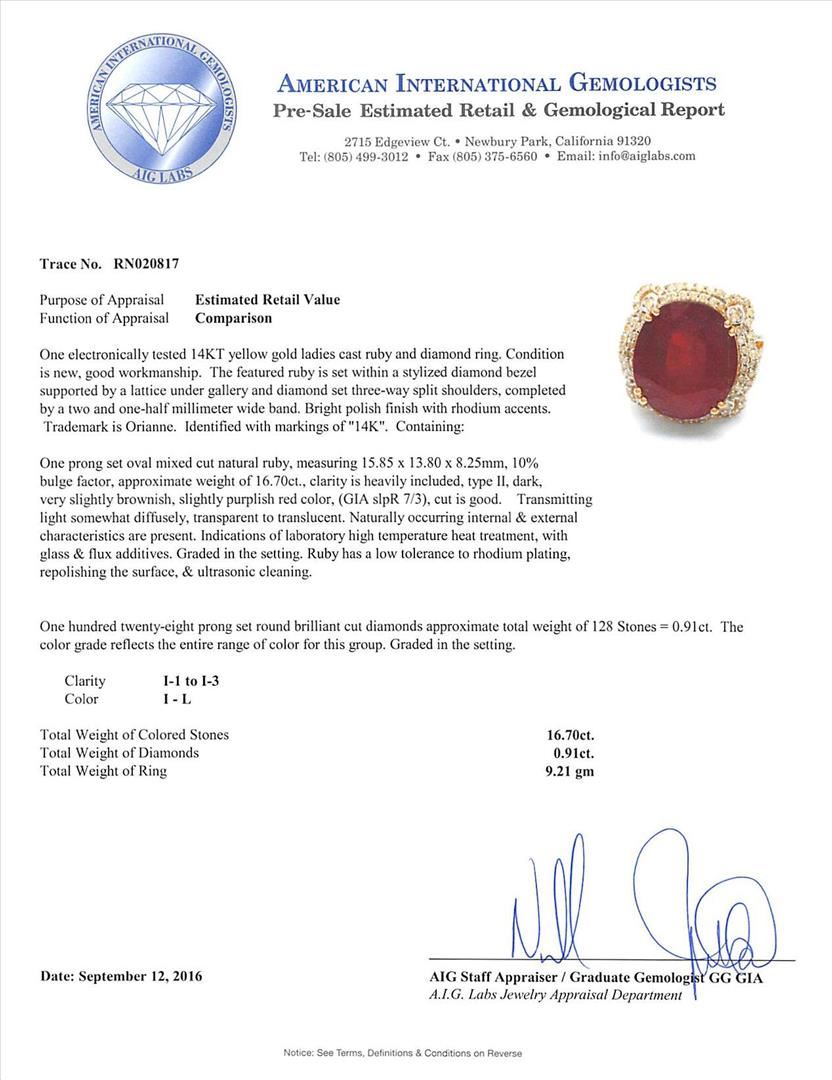 One electronically tested 14KT yellow gold ladies cast ruby and diamond ring. The featured ruby is set within a stylized diamond bezel supported by a lattice under gallery and diamond set three-way split shoulders, completed by a two and one-half millimeter wide band. Bright polish finish with rhodium accents. Trademark is Orianne. Identified with markings of "14K". Condition is new, good workmanship. Containing: One prong set oval mixed cut natural ruby, measuring 15.85 x 13.80 x 8.25mm, 10%. bulge factor, approximate weight of 16.70ct., clarity is heavily included, type II, dark, very slightly brownish, slightly purplish red color, (GIA slpR 7/3), cut is good. Transmitting light somewhat diffusely, transparent to translucent. Naturally occurring internal & externalcharacteristics are present. Indications of laboratory high temperature heat treatment, withglass & flux additives. Graded in the setting. Ruby has a low tolerance to rhodium plating,repolishing the surface, & ultrasonic cleaning.One Hundred Twenty-Eight prong set round brilliant cut diamonds approximate total weight of 128 Stones = 0.91ct. The color grade reflects the entire range of color for this group. Graded in the setting. Clarity: I-1 to I-3. Color: I - L. Total Weight of Colored Stones 16.70ct. Total Weight of Diamonds 0.91ct. Total Weight of Ring 9.21gm. AIG Appraised.