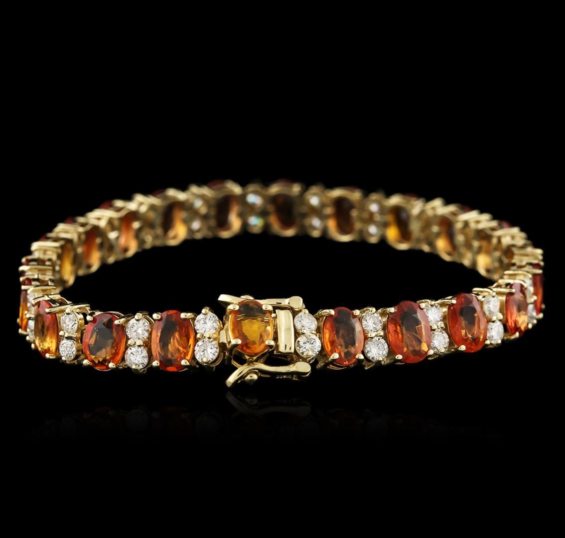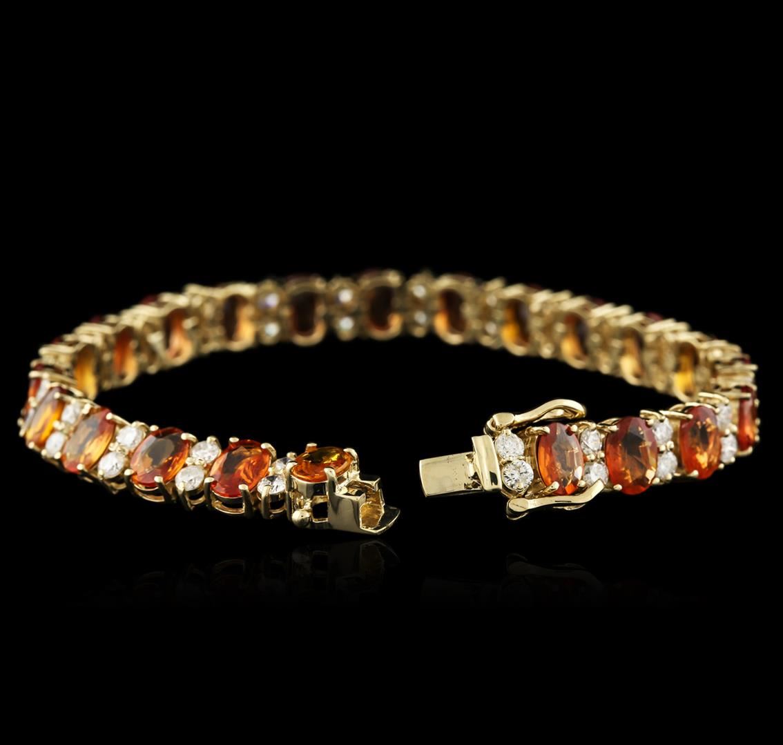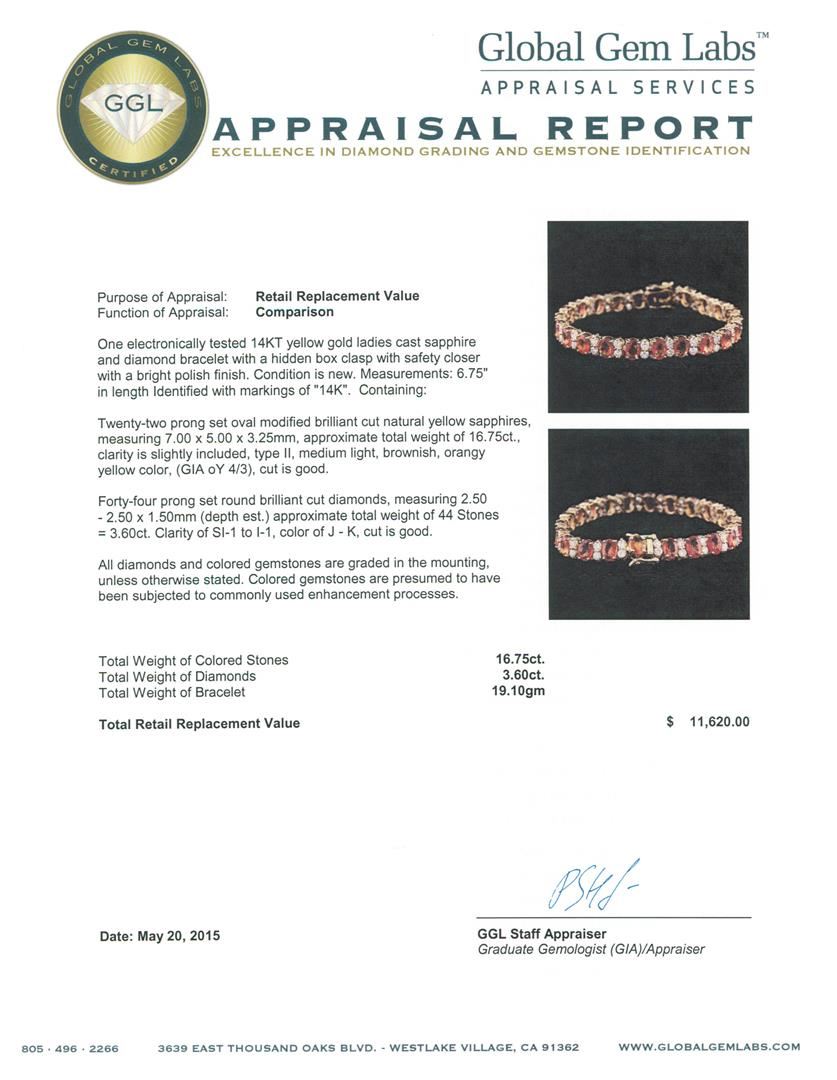 One electronically tested 14KT yellow gold ladies cast sapphire and diamond bracelet with a hidden box clasp with safety closer with a bright polish finish. Measurements: 6.75" in length Identified with markings of "14K". Condition is new. Containing: Twenty-two prong set oval modified brilliant cut natural yellow sapphires, measuring 7.00 x 5.00 x 3.25mm, approximate total weight of 16.75ct., clarity is slightly included, type II, medium light, brownish, orangy yellow color, (GIA oY 4/3), cut is good. Forty-Four prong set round brilliant cut diamonds, measuring 2.50 - 2.50 x 1.50mm (depth est.) approximate total weight of 44 Stones = 3.60ct. Clarity: SI-1 to I-1. Color: J - K, Cut is Good. All diamonds and colored gemstones are graded in the mounting, unless otherwise stated. Colored gemstones are presumed to have been subjected to commonly used enhancement processes. Total Weight of Colored Stones 16.75ct. Total Weight of Diamonds 3.60ct. Total Weight of Bracelet 19.10 grams. GGL Appraised at $11,620.00.