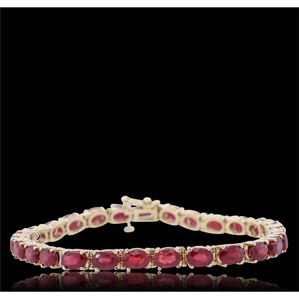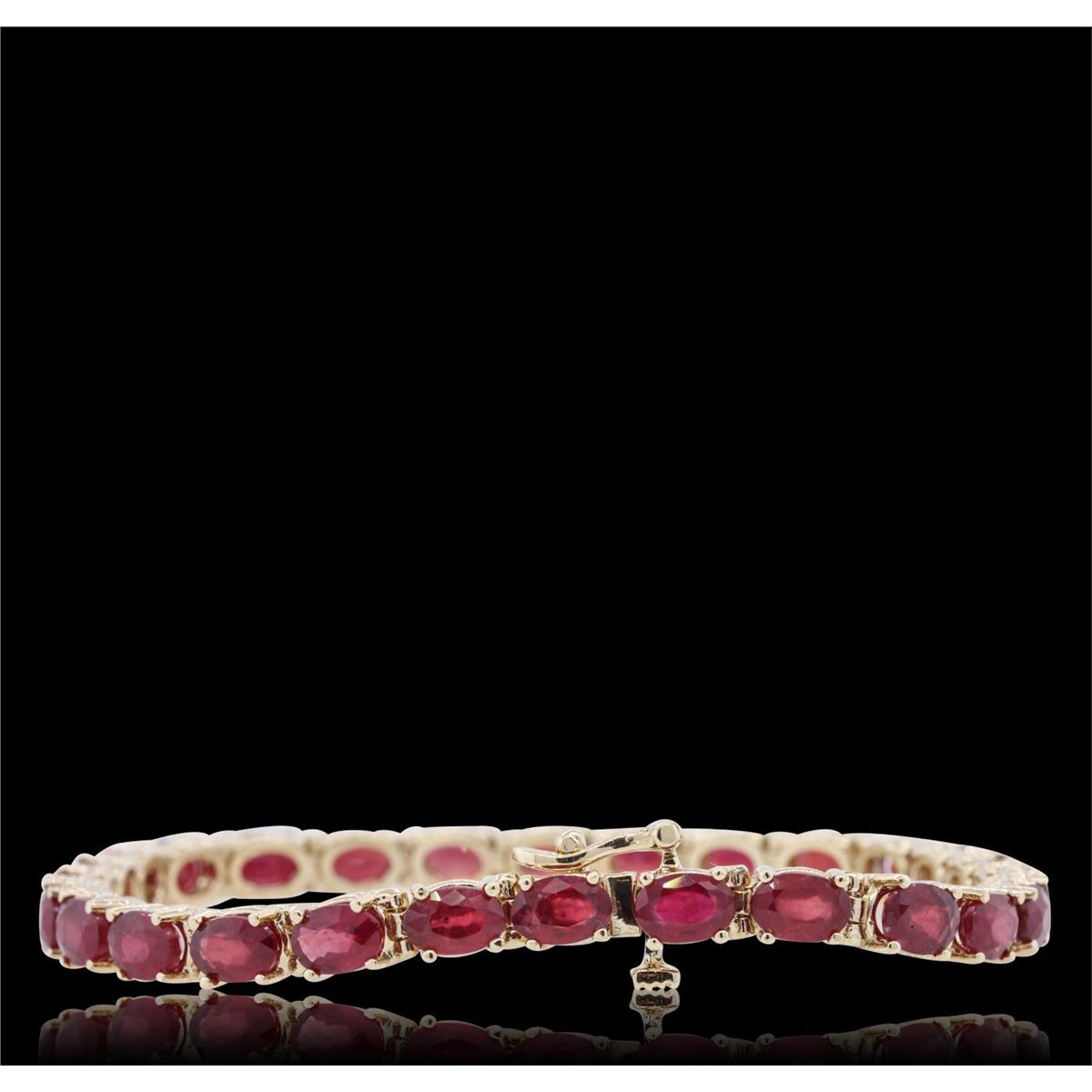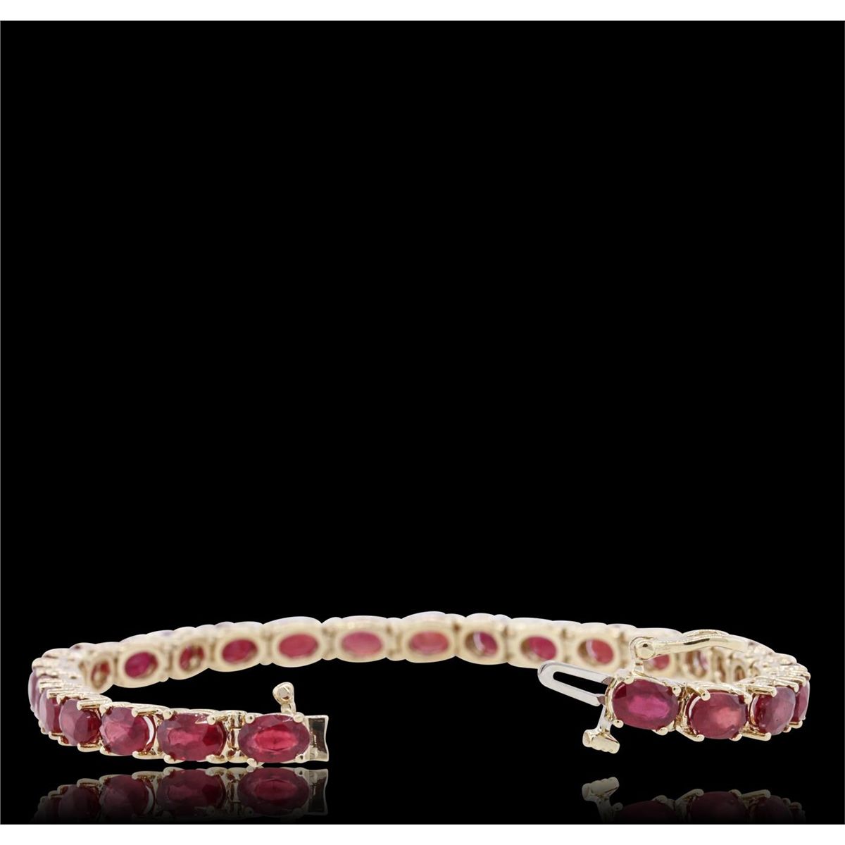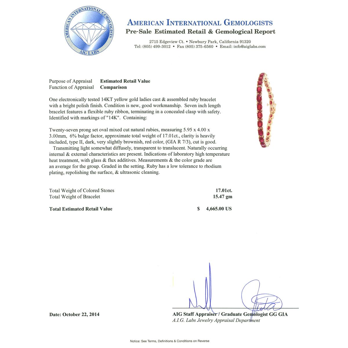 One electronically tested 14KT yellow gold ladies cast & assembled ruby bracelet with a bright polish finish. Seven inch length bracelet features a flexible ruby ribbon, terminating in a concealed clasp with safety. Identified with markings of 14K. Condition is new, good workmanship. Containing: Twenty-seven prong set oval mixed cut natural rubies, measuring 5.95 x 4.00 x 3.00mm, 6% bulge factor, approximate total weight of 17.01ct., clarity is heavily included, type II, dark, very slightly brownish, red color, (GIA R 7/3), cut is good. Transmitting light somewhat diffusely, transparent to translucent. Naturally occurring internal & external characteristics are present. Indications of laboratory high temperature heat treatment, with glass & flux additives. Measurements & the color grade are an average for the group. Graded in the setting. Ruby has a low tolerance to rhodium plating, repolishing the surface, & ultrasonic cleaning. Total Weight of Colored Stones 17.01ct. Total Weight of Bracelet 15.47 grams. AIG Appraised at $4,665.00.
