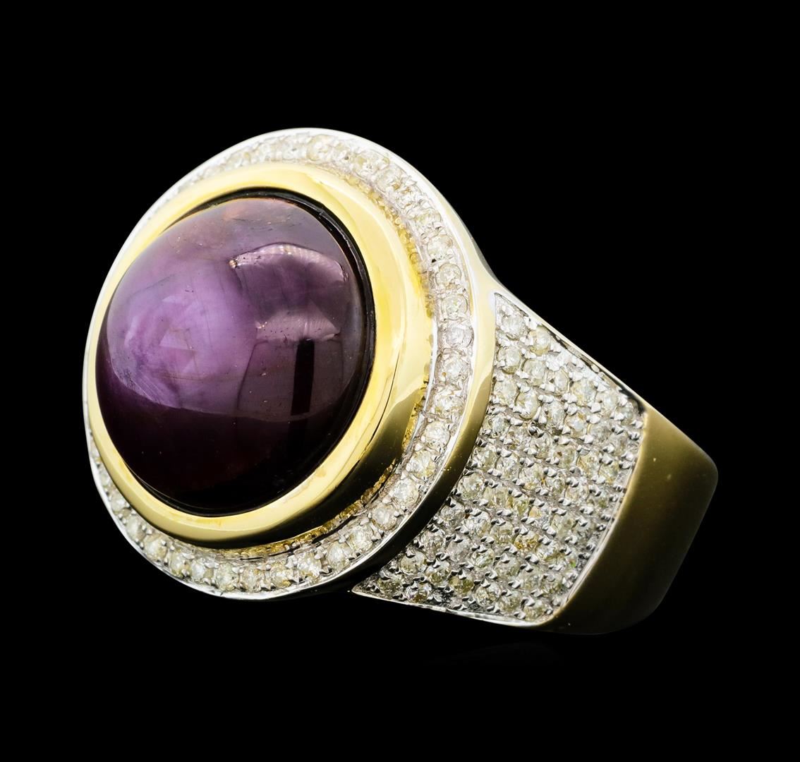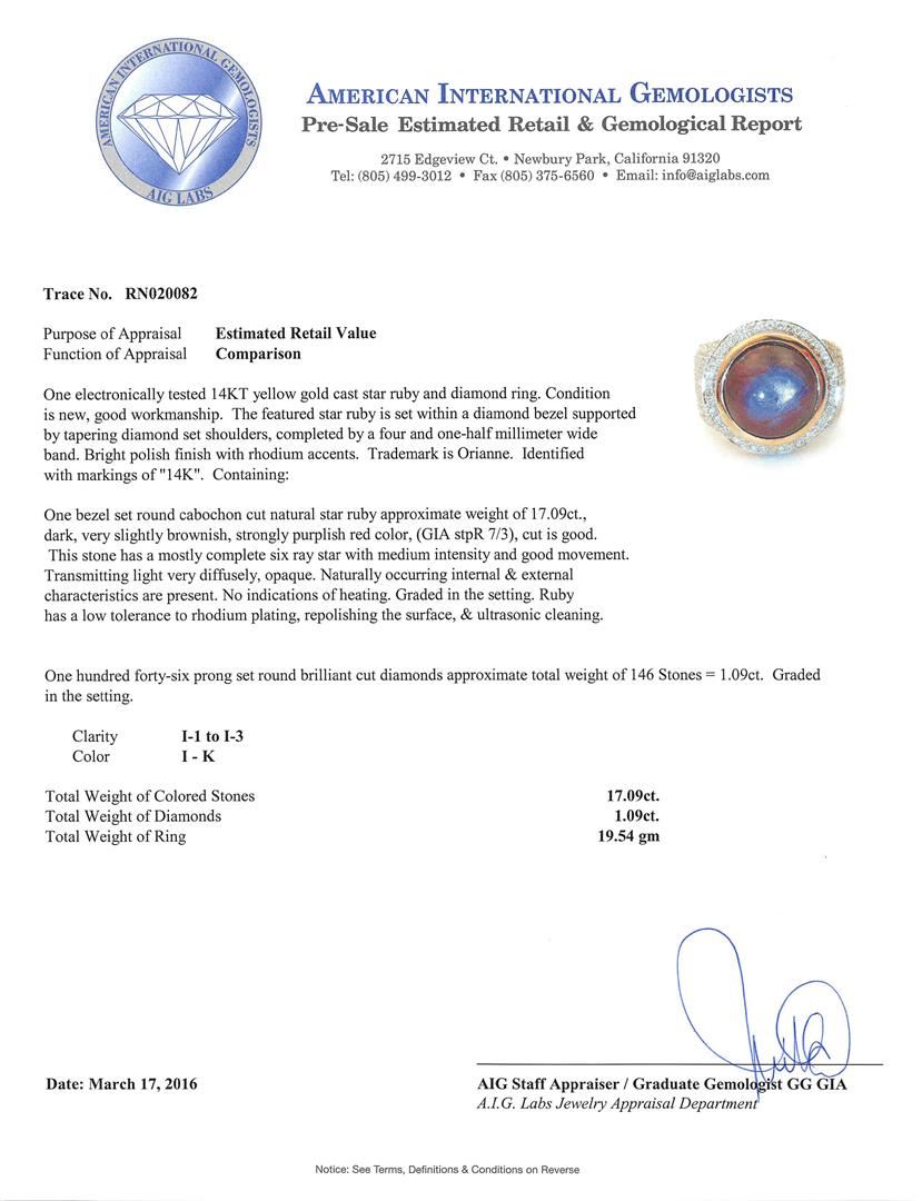 One electronically tested 14KT yellow gold cast star ruby and diamond ring. The featured star ruby is set within a diamond bezel supported by tapering diamond set shoulders, completed by a four and one-half millimeter wide band. Bright polish finish with rhodium accents. Trademark is Orianne. Identified with markings of "14K". Condition is new, good workmanship. Containing: One bezel set round cabochon cut natural star ruby approximate weight of 17.09ct., dark, very slightly brownish, strongly purplish red color, (GIA stpR 7/3), cut is good. This stone has a mostly complete six ray star with medium intensity and good movement. Transmitting light very diffusely, opaque. Naturally occurring internal & externalcharacteristics are present. No indications of heating. Graded in the setting. Rubyhas a low tolerance to rhodium plating, repolishing the surface, & ultrasonic cleaning.One Hundred Forty-Six prong set round brilliant cut diamonds approximate total weight of 146 Stones = 1.09ct. Graded in the setting. Clarity: I-1 to I-3. Color: I - K. Total Weight of Colored Stones 17.09ct. Total Weight of Diamonds 1.09ct. Total Weight of Ring 19.54gm. AIG Appraised.