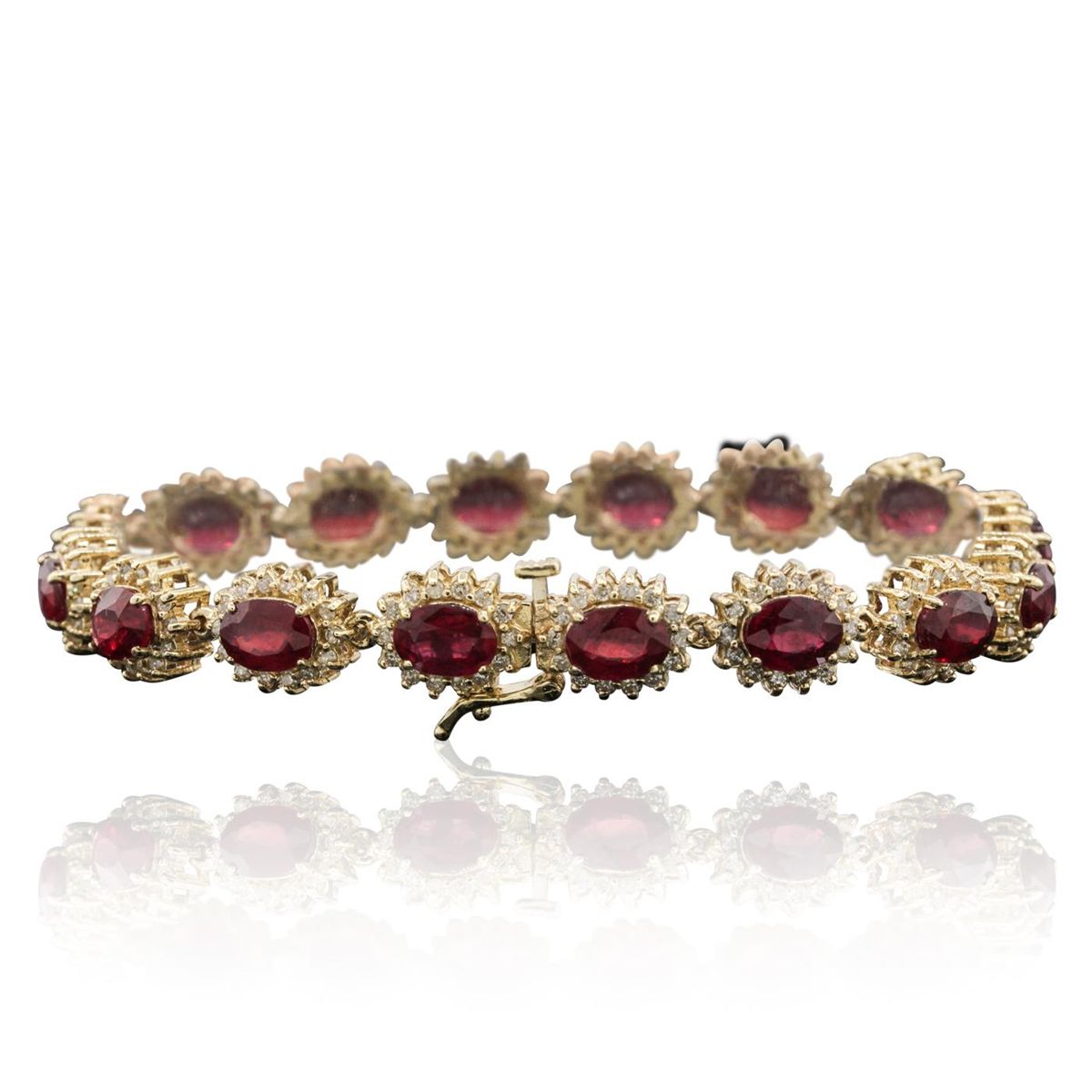 One electronically tested 14KT yellow gold ladies cast & assembled ruby and diamond bracelet with a bright polish finish. Condition is new, good workmanship. Seven and one-quarter inch length bracelet features a flexible ruby and diamond floret ribbon, terminating in a concealed clasp with safety. Identified with markings of "14K". Containing: Sixteen prong set oval mixed cut natural rubies, measuring 7.00 x 5.10 x 3.40mm, 8%. bulge factor, approximate. Total Weight of 17.28ct., clarity is heavily included, type II, medium dark, very slightly brownish, slightly purplish red color, (GIA slpR 6/3), cut is good. Transmitting light somewhat diffusely, transparent to translucent. Naturally occurring internal & external characteristics are present. Indications of laboratory high temperature heat treatment, with glass & flux additives. Measurements & the color grade are an average for the group. Graded in the setting. Ruby has a low tolerance to rhodium plating, repolishing the surface, & ultrasonic cleaning. Two Hundred Twenty-Four prong set round brilliant cut diamonds, measuring 1.40 - 1.30 x 0.81mm (depth est.) approximate. Total Weight of 224 Stones = 2.11ct. Graded in the setting. Clarity: I-1 to I-2. Color: H - J. Total Weight of Colored Stones 17.28ct. Total Weight of Diamonds 2.11ct. Total Weight of Bracelet 21.64 grams. AIG Appraised at $11,415.00.
