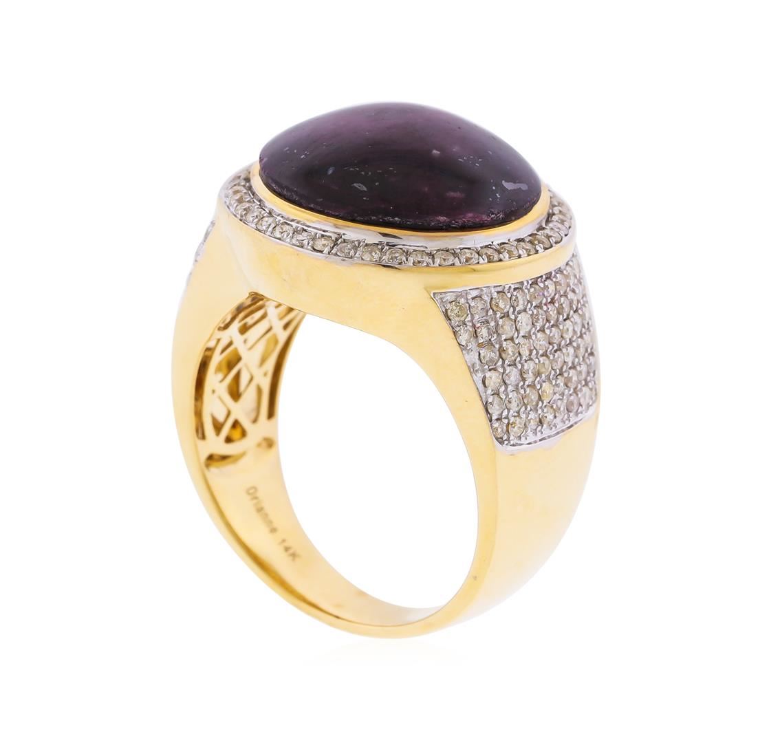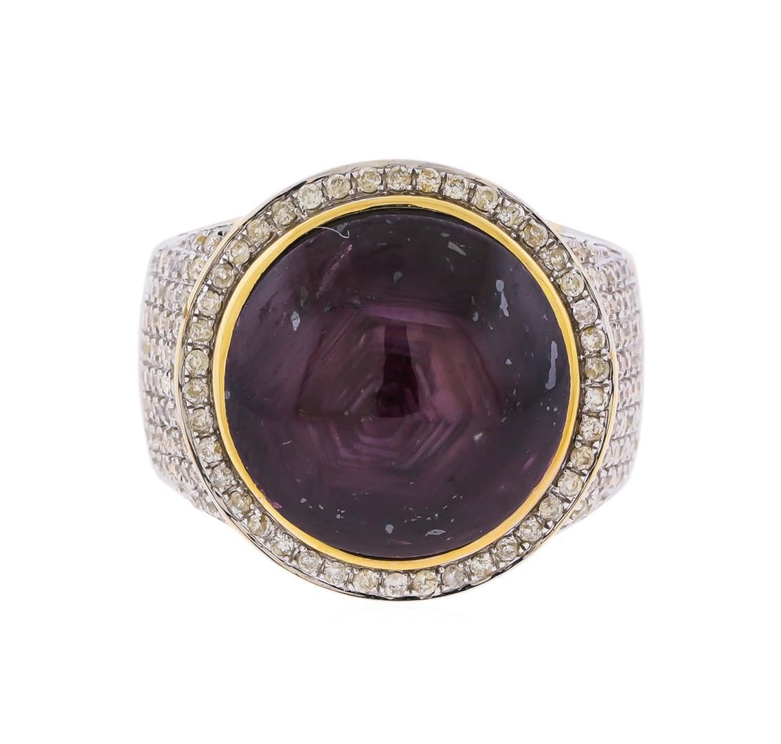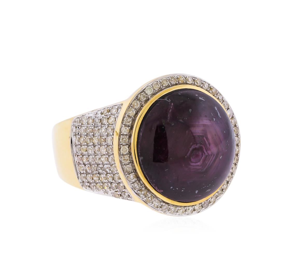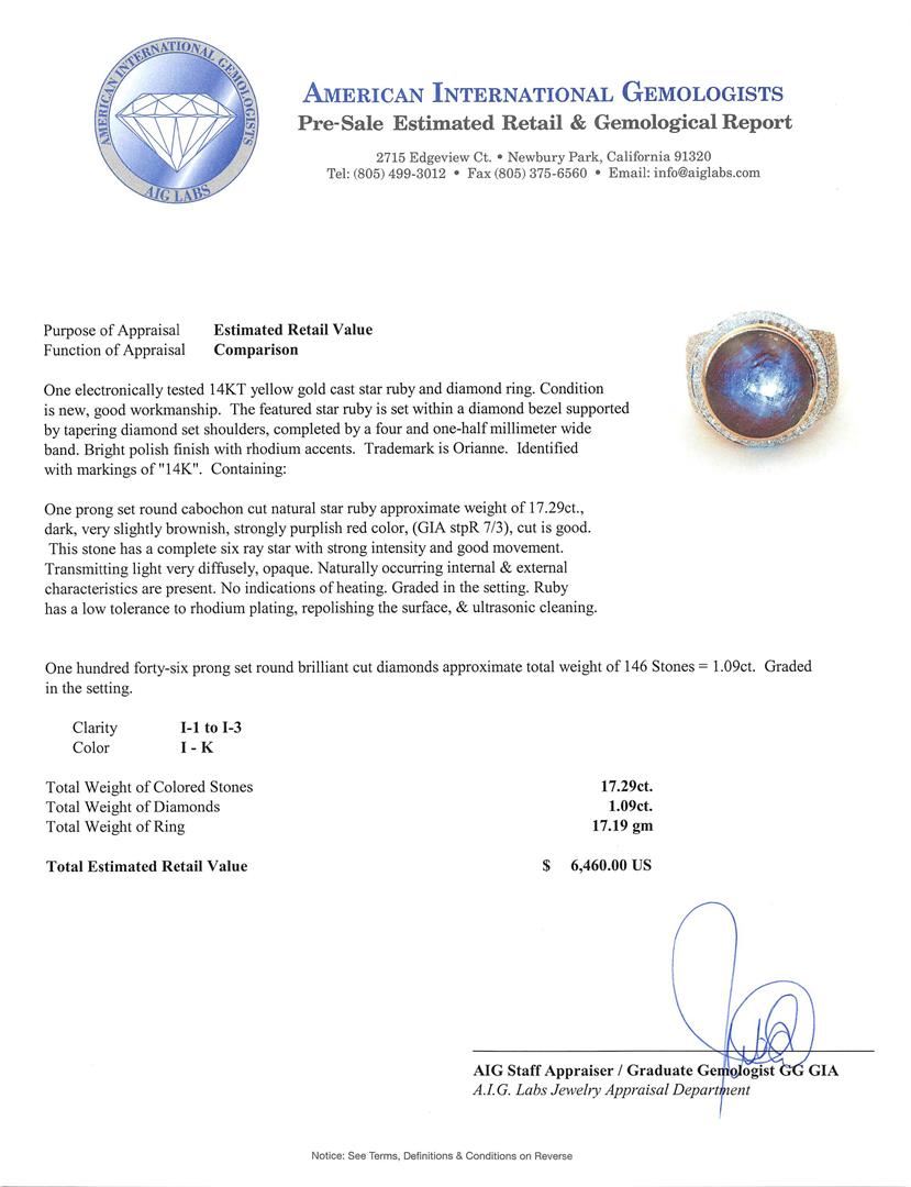 One electronically tested 14KT yellow gold cast star ruby and diamond ring. The featured star ruby is set within a diamond bezel supported by tapering diamond set shoulders, completed by a four and one-half millimeter wide band. Bright polish finish with rhodium accents. Trademark is Orianne. Identified with markings of "14K". Condition is new, good workmanship. Containing: One prong set round cabochon cut natural star ruby approximate weight of 17.29ct., dark, very slightly brownish, strongly purplish red color, (GIA stpR 7/3), cut is good. This stone has a complete six ray star with strong intensity and good movement. Transmitting light very diffusely, opaque. Naturally occurring internal & externalcharacteristics are present. No indications of heating. Graded in the setting. Rubyhas a low tolerance to rhodium plating, repolishing the surface, & ultrasonic cleaning.One Hundred Forty-Six prong set round brilliant cut diamonds approximate total weight of 146 Stones = 1.09ct. Graded in the setting. Clarity: I-1 to I-3. Color: I - K. Total Weight of Colored Stones 17.29ct. Total Weight of Diamonds 1.09ct. Total Weight of Ring 17.19gm. AIG Appraised at $6,460.00.
