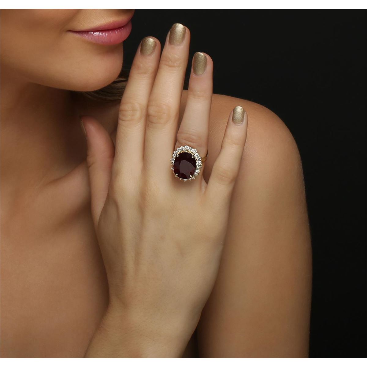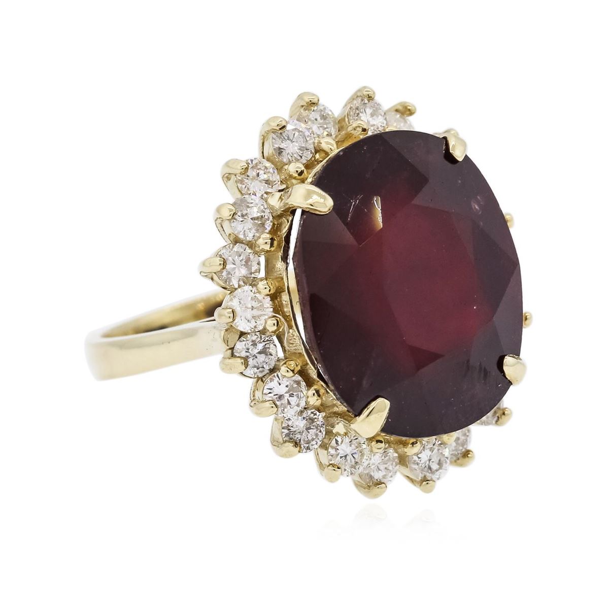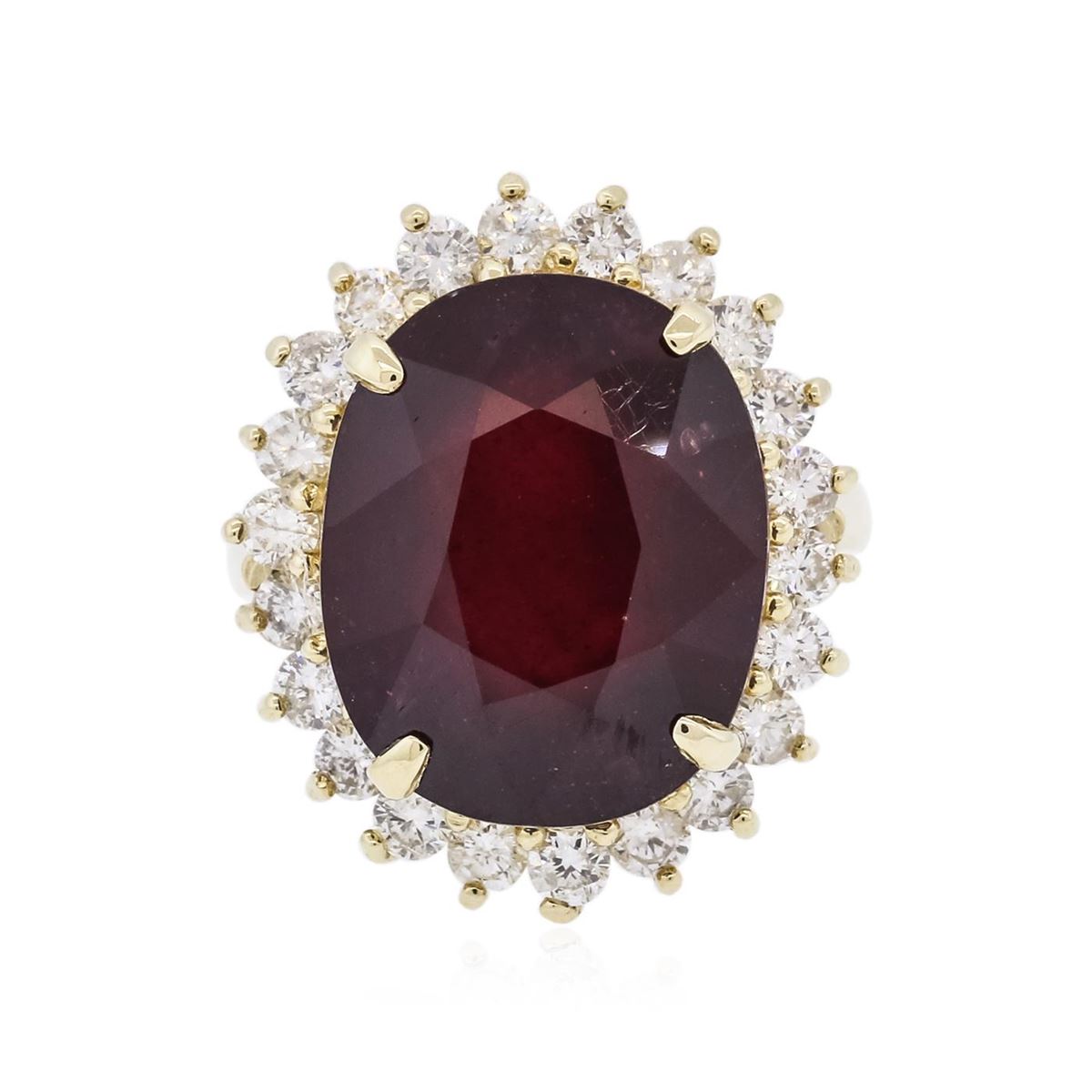 One electronically tested 14KT yellow gold ladies cast ruby and diamond ring with a bright polish finish. The featured ruby is set within a stylized diamond bezel, completed by a two and one-half millimeter wide band. Identified with markings of "14K". Condition is new, good workmanship. Containing: One prong set oval mixed cut natural ruby, measuring 16.40 x 13.30 x 9.10mm, 8% bulge factor, approximate weight of 17.34ct., clarity is heavily included, type II, dark, very slightly brownish, slightly purplish red color, (GIA slpR 7/3), cut is good. Transmitting light somewhat diffusely, transparent to translucent. Naturally occurring internal & external characteristics are present. Indications of laboratory high temperature heat treatment, with glass & flux additives. Graded in the setting. Ruby has a low tolerance to rhodium plating, repolishing the surface, & ultrasonic cleaning. Twenty-Two prong set round brilliant cut diamonds, measuring 2.50 - 2.30 x 1.44mm (depth est.) approximate total weight of 22 Stones = 1.21ct. Graded in the setting. Clarity: SI-1 to I-1. Color: G - I. Total Weight of Colored Stones 17.34ct. Total Weight of Diamonds 1.21ct. Total Weight of Ring 9.64 grams. AIG Appraised at $8,140.00.