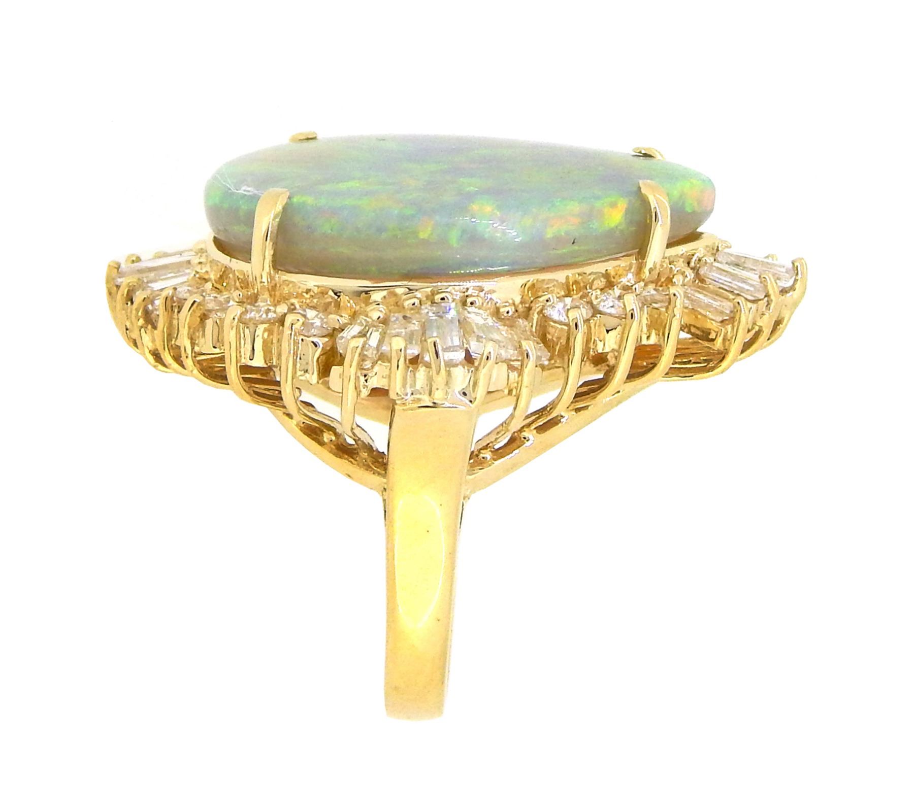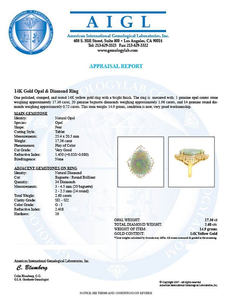 One 14KT Yellow Gold 17.36ct Opal and Diamond Ring. (1) Opal with a total weight of 17.36cts. (34) diamonds with a total weight of 2.68cts. Total weight of this ring is 14.9 grams.