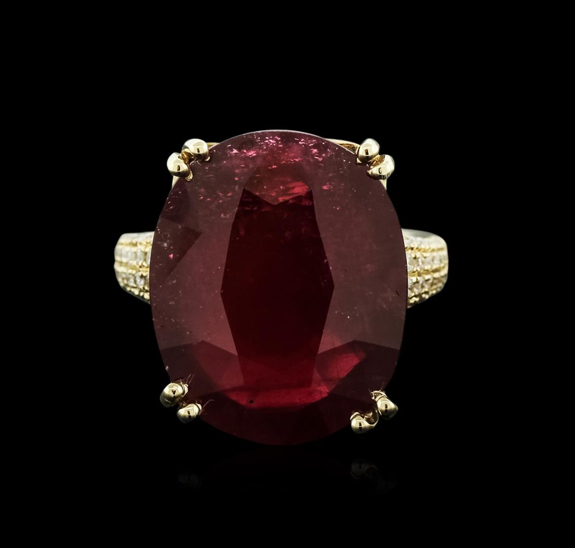 One electronically tested 14KT yellow gold ladies cast ruby and diamond ring with a bright polish finish. Identified with markings of "14K". Condition is new. Containing: One prong set oval modified brilliant cut natural ruby, measuring 20.00 x 16.00 x 6.42mm, approximate weight of 17.47ct., clarity is heavily included, type II, medium dark, moderately strong, strongly purplish red color, (GIA stpR 6/4), cut is good. Forty-Six prong set round brilliant cut diamonds, measuring 1.30 - 1.20 x 0.75mm (depth est.) approximate total weight of 46 Stones = 0.33ct. Clarity: I-1 to I-2. Color: K - L, Cut is Good. Colored gemstones are presumed to have been subjected to commonly used enhancement processes. All diamonds and colored gemstones are graded in the mounting, unless otherwise stated. Total Weight of Colored Stones 17.47ct. Total Weight of Diamonds 0.33ct. Total Weight of Ring 11.90 grams. GGL Appraised at $4,925.00.