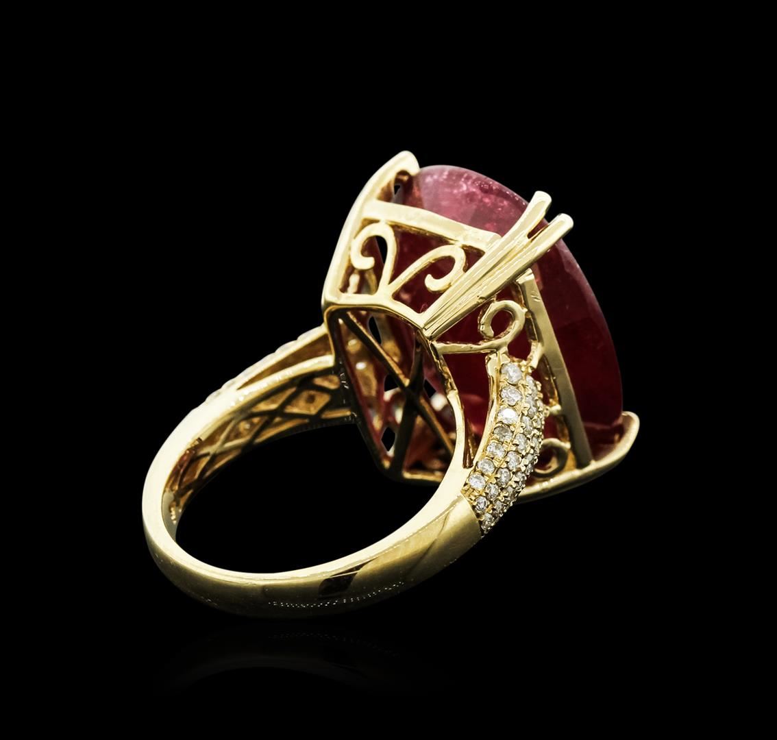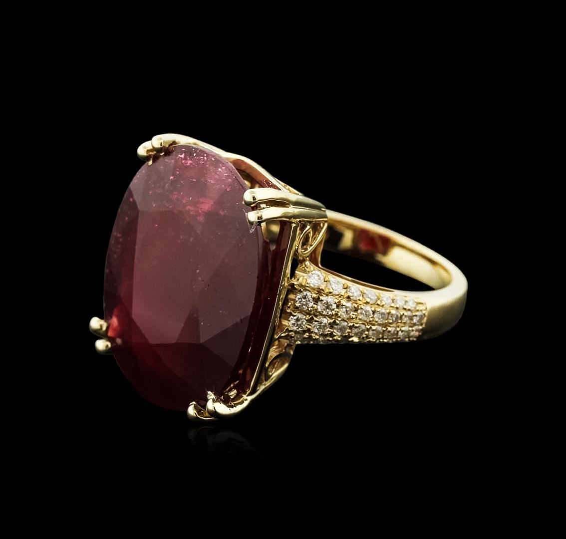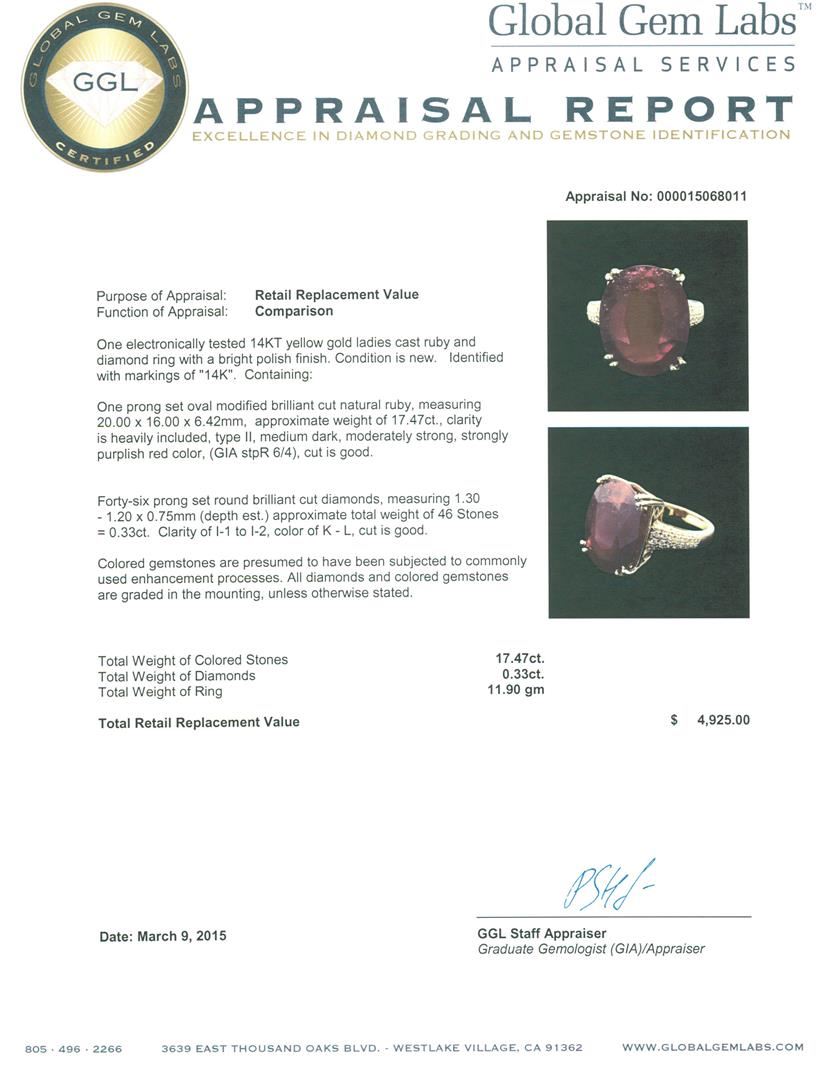 One electronically tested 14KT yellow gold ladies cast ruby and diamond ring with a bright polish finish. Identified with markings of "14K". Condition is new. Containing: One prong set oval modified brilliant cut natural ruby, measuring 20.00 x 16.00 x 6.42mm, approximate weight of 17.47ct., clarity is heavily included, type II, medium dark, moderately strong, strongly purplish red color, (GIA stpR 6/4), cut is good. Forty-Six prong set round brilliant cut diamonds, measuring 1.30 - 1.20 x 0.75mm (depth est.) approximate total weight of 46 Stones = 0.33ct. Clarity: I-1 to I-2. Color: K - L, Cut is Good. Colored gemstones are presumed to have been subjected to commonly used enhancement processes. All diamonds and colored gemstones are graded in the mounting, unless otherwise stated. Total Weight of Colored Stones 17.47ct. Total Weight of Diamonds 0.33ct. Total Weight of Ring 11.90 grams. GGL Appraised at $4,925.00.