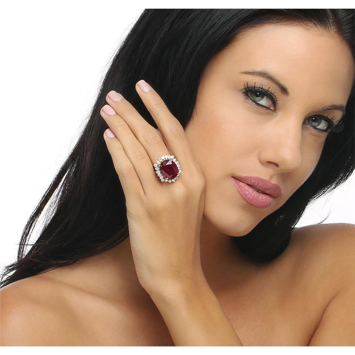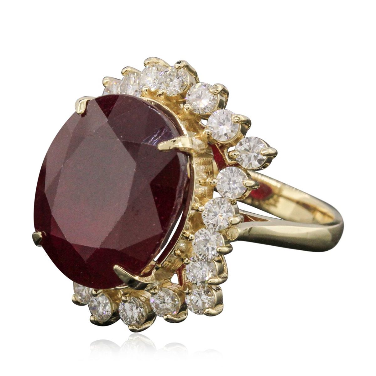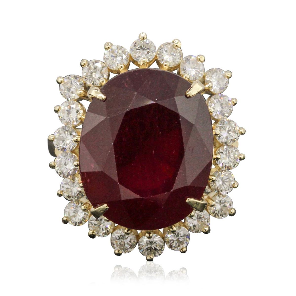 One electronically tested 14KT yellow gold ladies cast ruby and diamond ring with a bright polish finish. Condition is new, good workmanship. The featured ruby is set within a stylized diamond bezel, completed by a two and one-half millimeter wide band. Identified with markings of "K14". Containing: One prong set oval mixed cut natural ruby, measuring 16.20 x 13.50 x 9.25mm, 8%. bulge factor, approximate weight of 17.62ct., clarity is heavily included, type II, dark, very slightly brownish, slightly purplish red color, (GIA slpR 7/3), cut is good. Transmitting light somewhat diffusely, transparent to translucent. Naturally occurring internal & external characteristics are present. Indications of laboratory high temperature heat treatment, with glass & flux additives. Graded in the setting. Ruby has a low tolerance to rhodium plating, repolishing the surface, & ultrasonic cleaning. Twenty-Two prong set round brilliant cut diamonds, measuring 2.70 - 2.60 x 1.59mm (depth est.) approximate. Total Weight of 22 Stones = 1.59ct. Graded in the setting. Clarity: SI-1 to I-1. Color: G - I. Total Weight of Colored Stones 17.62ct. Total Weight of Diamonds 1.59ct. Total Weight of Ring 10.40gm. AIG Appraised at $9,385.00.
