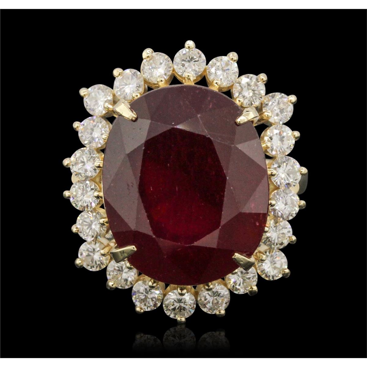 One electronically tested 14KT yellow gold ladies cast ruby and diamond ring with a bright polish finish. Condition is new, good workmanship. The featured ruby is set within a stylized diamond bezel, completed by a two and one-half millimeter wide band. Identified with markings of "K14". Containing: One prong set oval mixed cut natural ruby, measuring 16.20 x 13.50 x 9.25mm, 8%. bulge factor, approximate weight of 17.62ct., clarity is heavily included, type II, dark, very slightly brownish, slightly purplish red color, (GIA slpR 7/3), cut is good. Transmitting light somewhat diffusely, transparent to translucent. Naturally occurring internal & external characteristics are present. Indications of laboratory high temperature heat treatment, with glass & flux additives. Graded in the setting. Ruby has a low tolerance to rhodium plating, repolishing the surface, & ultrasonic cleaning. Twenty-Two prong set round brilliant cut diamonds, measuring 2.70 - 2.60 x 1.59mm (depth est.) approximate. Total Weight of 22 Stones = 1.59ct. Graded in the setting. Clarity: SI-1 to I-1. Color: G - I. Total Weight of Colored Stones 17.62ct. Total Weight of Diamonds 1.59ct. Total Weight of Ring 10.40gm. AIG Appraised at $9,385.00.