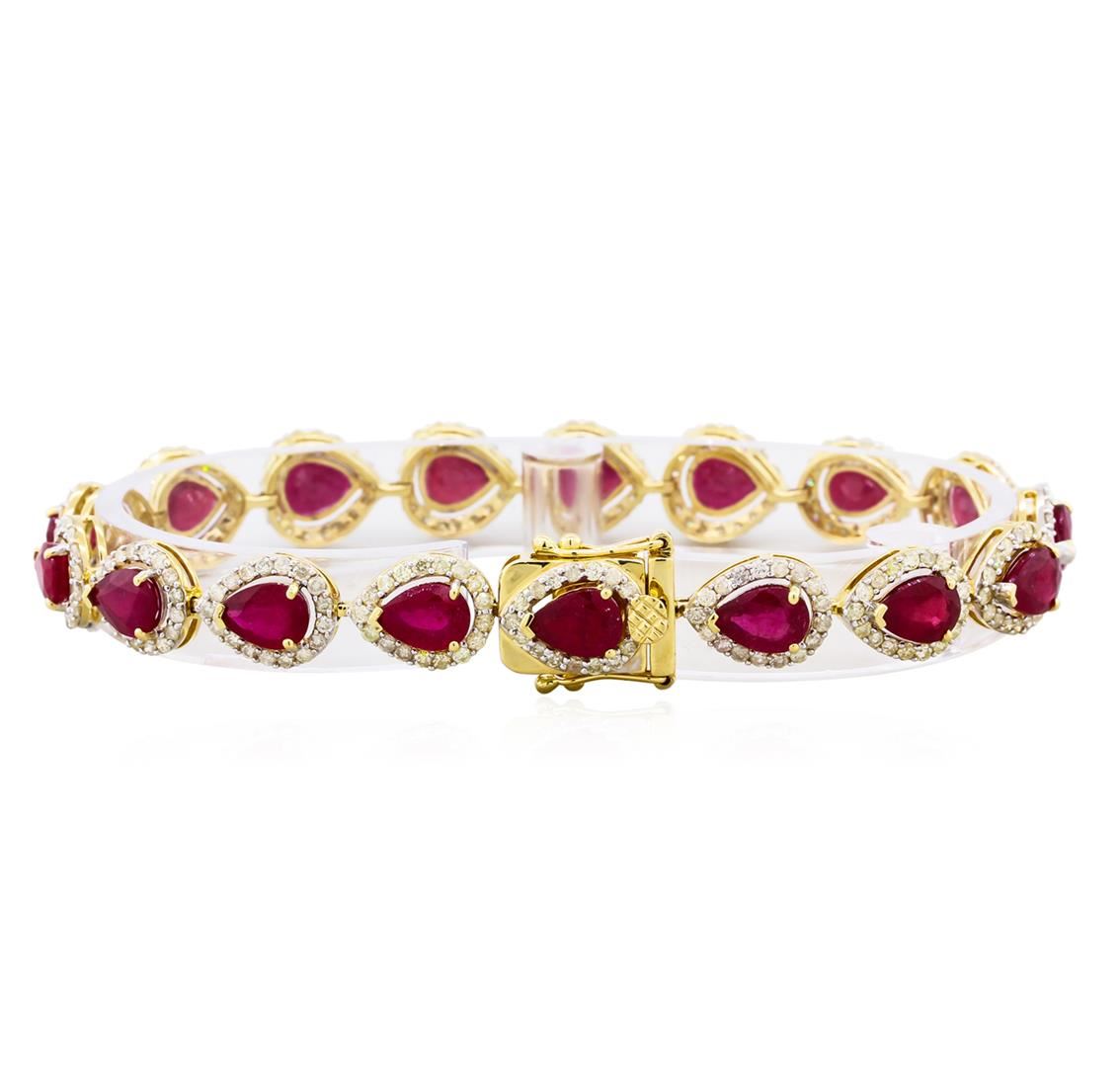 One electronically tested 14KT yellow gold ladies cast & assembled ruby and diamond bracelet. Seven and one-half inch length bracelet features a flexible ruby and diamond bezel ribbon, terminating in a concealed clasp with twin safeties. Bright polish finish with rhodium accents. Trademark is Orianne. Identified with markings of "14K". Condition is new, good workmanship. Containing: Seventeen prong set pear mixed cut natural rubies, measuring 7.00 x 5.00 x 3.25mm, 12%. bulge factor, approximate. Total Weight of 17.63ct., clarity is heavily included, type II, dark, very slightly brownish, slightly purplish red color, (GIA slpR 7/3), cut is good. Transmitting light somewhat diffusely, transparent to translucent. Naturally occurring internal & external characteristics are present. Indications oflaboratory high temperature heat treatment, with glass & flux additives. Measurements& the color grade are an average for the group. Graded in the setting. Ruby has a lowtolerance to rhodium plating, repolishing the surface, & ultrasonic cleaning.Two Hundred Eighty-Nine prong set round brilliant cut diamonds, measuring 1.40 - 1.30 x 0.81mm (depth est.) approximate. Total Weight of 289 Stones = 2.67ct. Color grade is an average for the group. Graded in the setting. Clarity: I-2 to I-3. Total Weight of Colored Stones 17.63ct. Total Weight of Diamonds 2.67ct. AIG Appraised at $9,940.00.