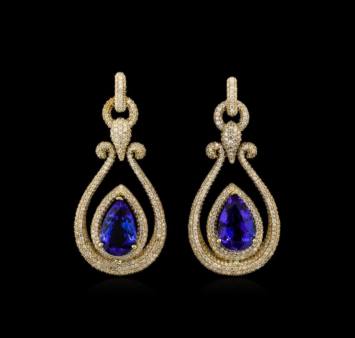 One pair electronically tested 14KT yellow gold ladies cast & assembled tanzanite and diamond earrings with standard backs. Each earring features a tanzanite set within elaborate diamond bezels, completed by a diamond set drop. Bright polish finish. Identified with markings of "14K". Condition is new, good workmanship. Containing: Two prong set pear mixed cut natural tanzanite, measuring 15.50 x 10.00 x 7.00mm, 20% bulge factor, approximate total weight of 17.82ct., clarity is eye clean, type I, medium dark, moderately strong, violetish blue color, (GIA Vb 6/4), cut is good. Transmitting light with no distortion, transparent. Measurements & the color graded are an average for the pair. Graded in the setting. Tanzanite is a very rare gemstone that is only found in the country of Tanzania. Originally discovered in 1967. Tiffany & Company, named the stone tanzanite. It is found in the Usumburu Mountains that border the umba valley of northern tanzanite. Tanzanite occurs in gray, brown, violet, blue, reddish-purplish & green. The gem is interesting because of its exceptional pleochroism. Rotated in different directions a tanzanite will exhibit multiple change of color. Tanzanite has a low tolerance to ultrasonic cleaning, and should not be cleaned using this method. Numerous pave set round brilliant cut diamonds, measuring 1.50 -- 1.20 x 0.81mm (depth est.) approximate total weight of the stones = 7.32ct. Graded in the setting. Clarity SI-1 to I-1. Color G-I. Total weight of Tanzanite 17.82ct. Total weight of Diamonds 7.32ct. Total weight of Earrings 25.84gm. AIG Appraised at $73,755.00.