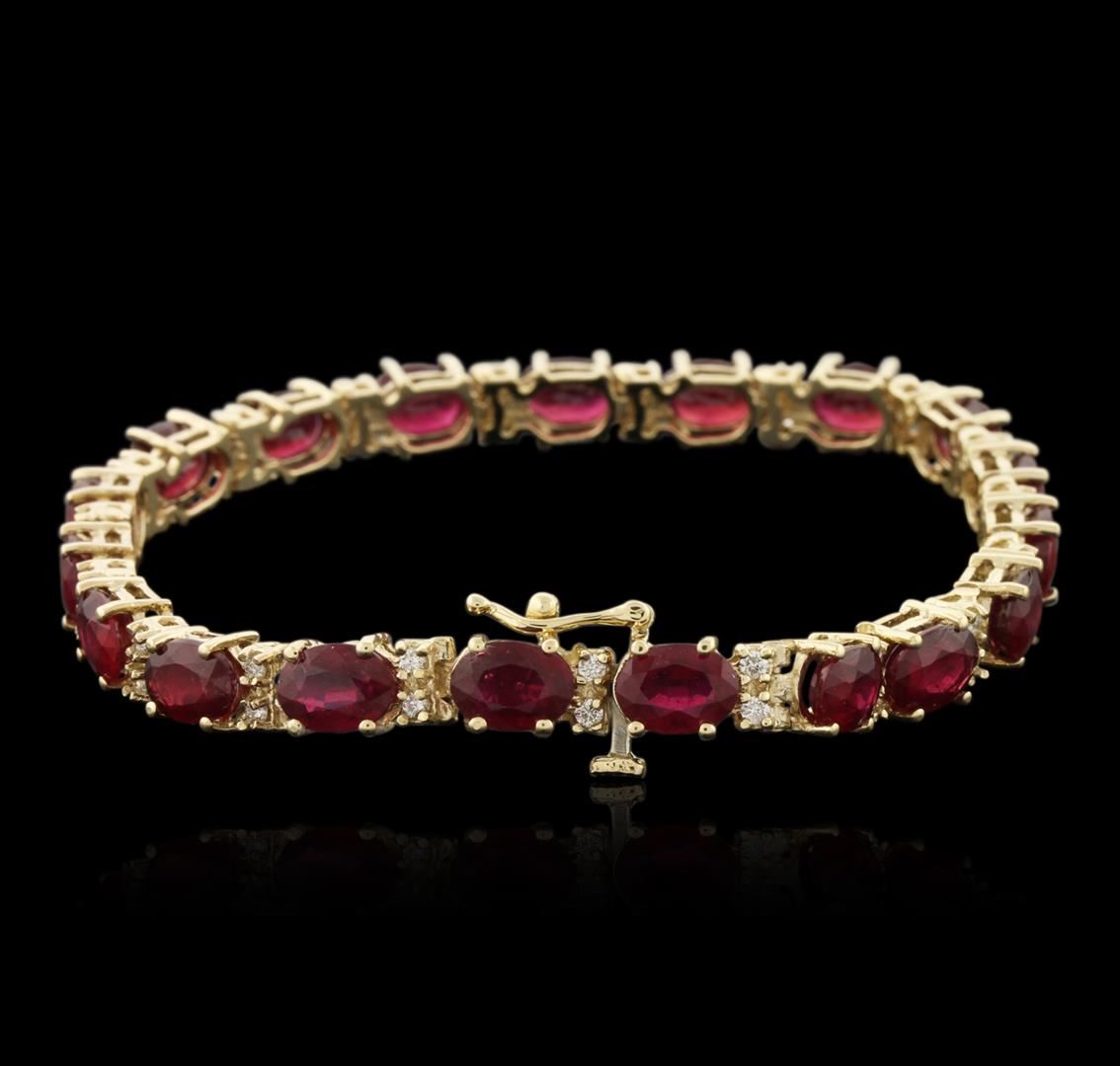 One electronically tested 14KT yellow gold ladies cast ruby and diamond bracelet with a hidden box clasp with safety closer with a bright polish finish. Measurements: 7" in length Identified with markings of "14K". Condition is new. Containing: Nineteen prong set oval modified brilliant cut natural rubies, measuring 6.80 x 5.00. x 3.25mm, approximate total weight of 17.86ct., clarity is heavily included, medium, moderately strong, purple red color, (GIA PR 5/4), cut is good. Thirty-Eight prong set round brilliant cut diamonds, measuring 1.30 - 1.30 x 0.78mm (depth est.) approximate total weight of 38 Stones = 0.30ct. Clarity: SI-1 to SI-2. Color: J - K, Cut is Good. Colored gemstones are presumed to have been subjected to commonly used enhancement processes. All diamonds and colored gemstones are graded in the mounting, unless otherwise stated. Total Weight of Colored Stones 17.86ct. Total Weight of Diamonds 0.30ct. Total Weight of Bracelet 16.10 grams. GGL Appraised at $4,840.00.