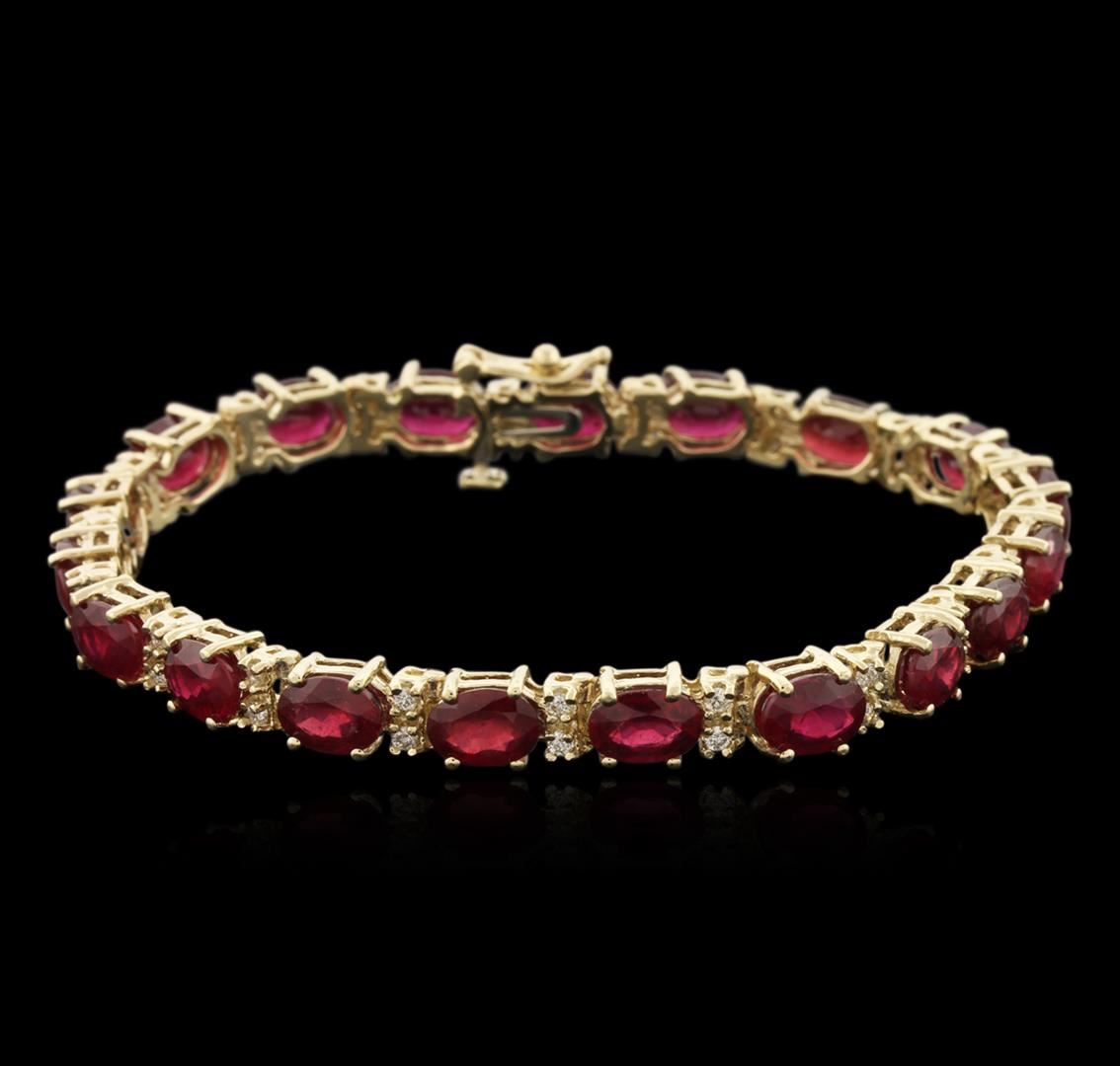 One electronically tested 14KT yellow gold ladies cast ruby and diamond bracelet with a hidden box clasp with safety closer with a bright polish finish. Measurements: 7" in length Identified with markings of "14K". Condition is new. Containing: Nineteen prong set oval modified brilliant cut natural rubies, measuring 6.80 x 5.00. x 3.25mm, approximate total weight of 17.86ct., clarity is heavily included, medium, moderately strong, purple red color, (GIA PR 5/4), cut is good. Thirty-Eight prong set round brilliant cut diamonds, measuring 1.30 - 1.30 x 0.78mm (depth est.) approximate total weight of 38 Stones = 0.30ct. Clarity: SI-1 to SI-2. Color: J - K, Cut is Good. Colored gemstones are presumed to have been subjected to commonly used enhancement processes. All diamonds and colored gemstones are graded in the mounting, unless otherwise stated. Total Weight of Colored Stones 17.86ct. Total Weight of Diamonds 0.30ct. Total Weight of Bracelet 16.10 grams. GGL Appraised at $4,840.00.