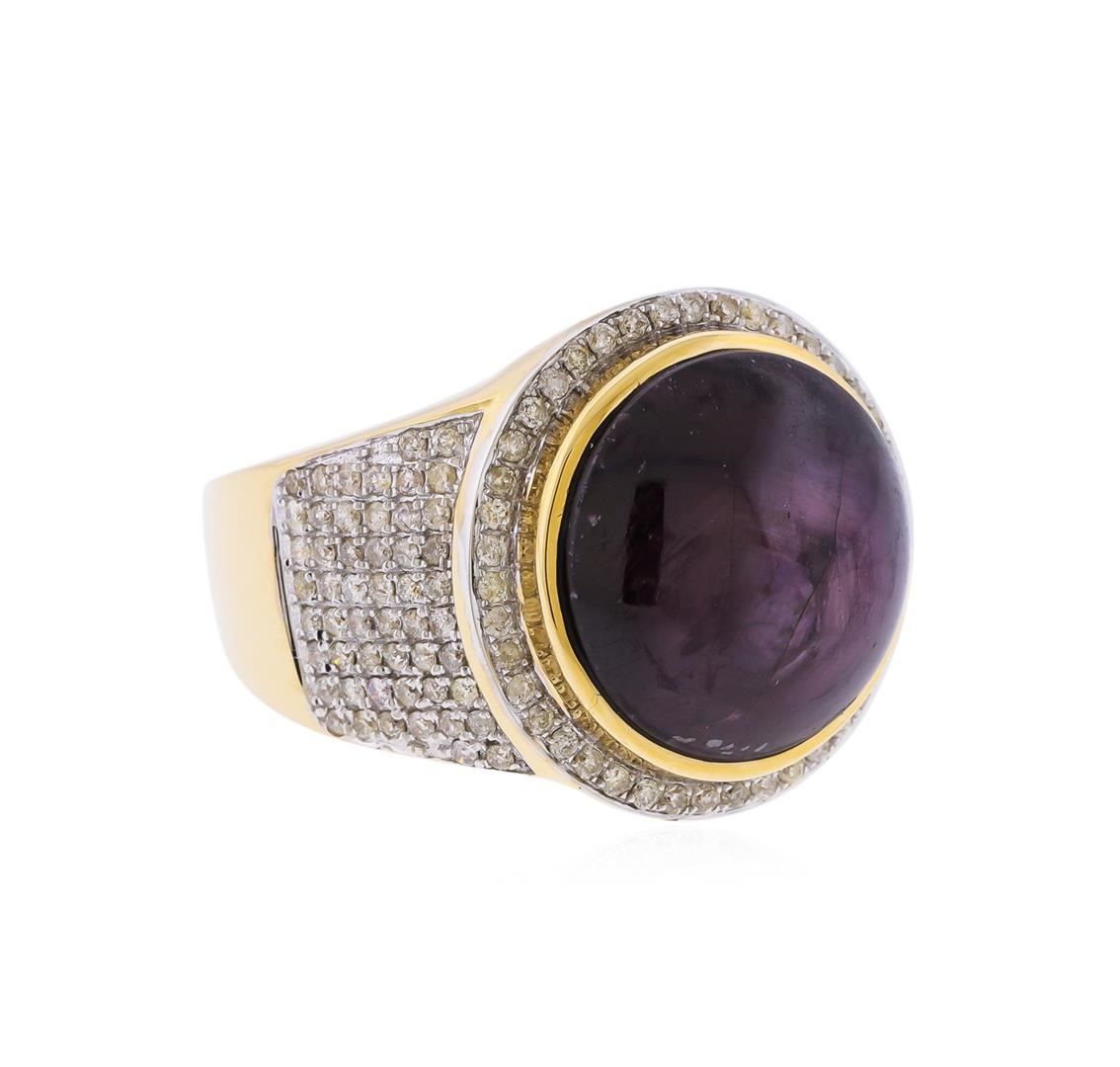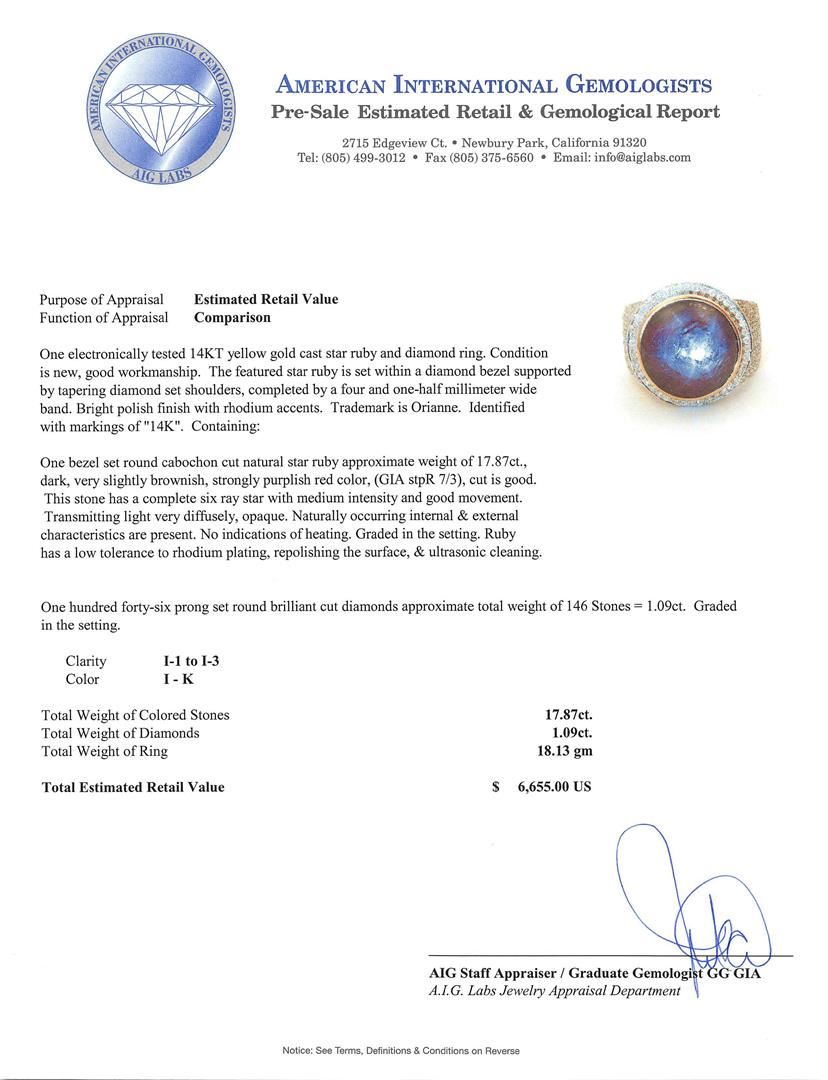 One electronically tested 14KT yellow gold cast star ruby and diamond ring. The featured star ruby is set within a diamond bezel supported by tapering diamond set shoulders, completed by a four and one-half millimeter wide band. Bright polish finish with rhodium accents. Trademark is Orianne. Identified with markings of "14K". Condition is new, good workmanship. Containing: One bezel set round cabochon cut natural star ruby approximate weight of 17.87ct., dark, very slightly brownish, strongly purplish red color, (GIA stpR 7/3), cut is good. This stone has a complete six ray star with medium intensity and good movement. Transmitting light very diffusely, opaque. Naturally occurring internal & externalcharacteristics are present. No indications of heating. Graded in the setting. Rubyhas a low tolerance to rhodium plating, repolishing the surface, & ultrasonic cleaning.One Hundred Forty-Six prong set round brilliant cut diamonds approximate total weight of 146 Stones = 1.09ct. Graded in the setting. Clarity: I-1 to I-3. Color: I - K. Total Weight of Colored Stones 17.87ct. Total Weight of Diamonds 1.09ct. Total Weight of Ring 18.13gm. AIG Appraised at $6,655.00.