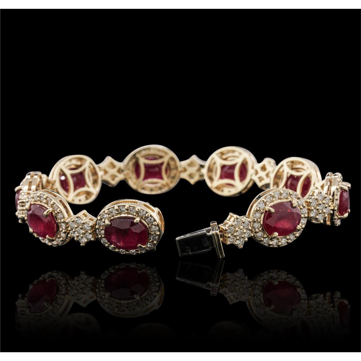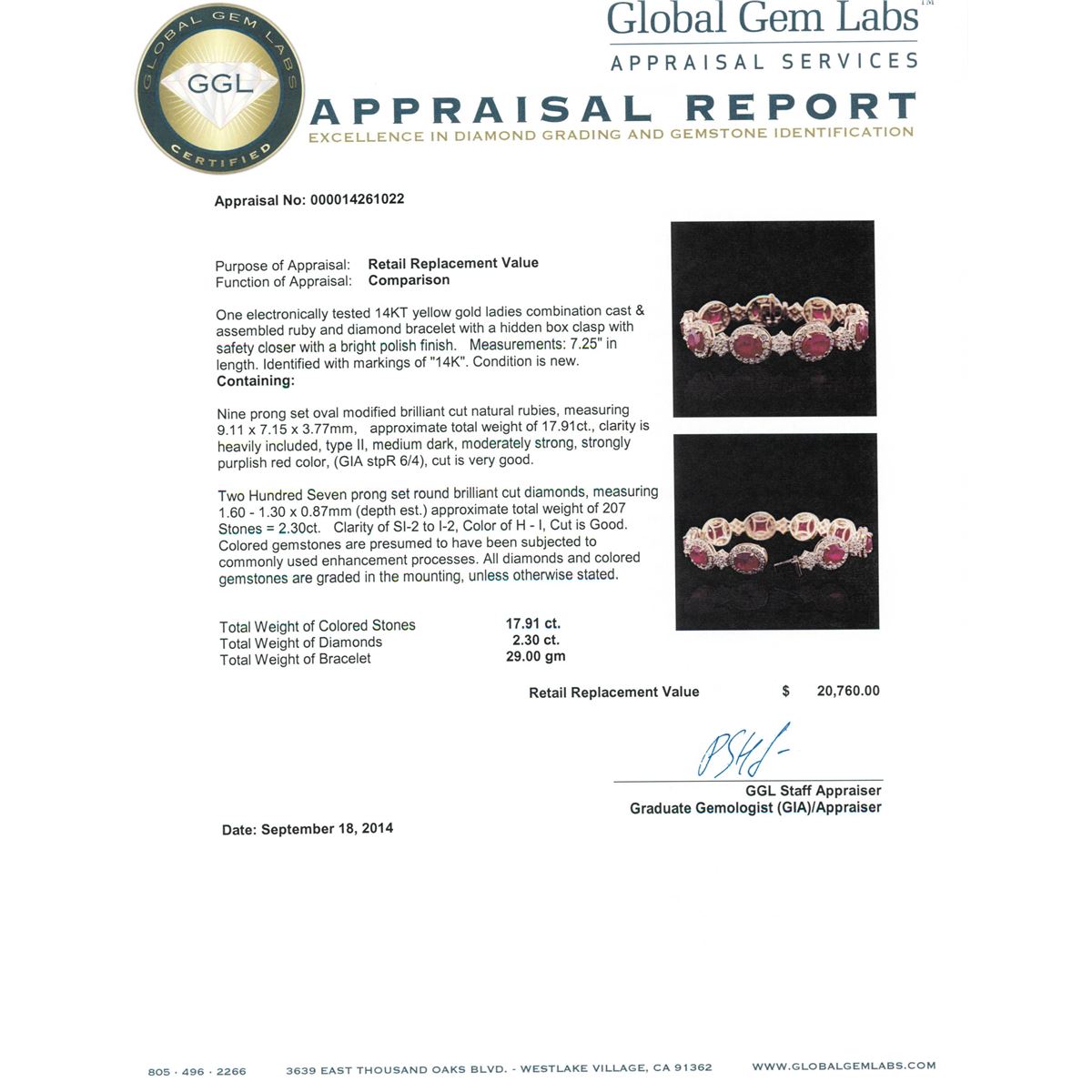 One electronically tested 14KT yellow gold ladies combination cast & assembled ruby and diamond bracelet with a hidden box clasp with safety closer with a bright polish finish. Measurements: 7.25" in length. Identified with markings of "14K". Condition is new. Containing: Nine prong set oval modified brilliant cut natural rubies, measuring 9.11 x 7.15 x 3.77mm, approximate total weight of 17.91ct., clarity is heavily included, type II, medium dark, moderately strong, strongly purplish red color, (GIA stpR 6/4), cut is very good. Two Hundred Seven prong set round brilliant cut diamonds, measuring 1.60 - 1.30 x 0.87mm (depth est.) approximate total weight of 207 Stones = 2.30ct. Clarity: SI-2 to I-2. Color: H - I, Cut is Good. Colored gemstones are presumed to have been subjected to commonly used enhancement processes. All diamonds and colored gemstones are graded in the mounting, unless otherwise stated. Total Weight of Colored Stones 17.91ct. Total Weight of Diamonds 2.30ct. Total Weight of Bracelet 29.00 grams. GGL Appraised at $20,760.00.