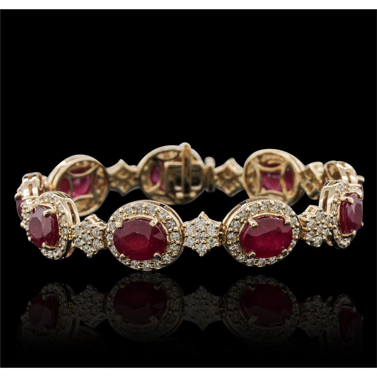 One electronically tested 14KT yellow gold ladies combination cast & assembled ruby and diamond bracelet with a hidden box clasp with safety closer with a bright polish finish. Measurements: 7.25" in length. Identified with markings of "14K". Condition is new. Containing: Nine prong set oval modified brilliant cut natural rubies, measuring 9.11 x 7.15 x 3.77mm, approximate total weight of 17.91ct., clarity is heavily included, type II, medium dark, moderately strong, strongly purplish red color, (GIA stpR 6/4), cut is very good. Two Hundred Seven prong set round brilliant cut diamonds, measuring 1.60 - 1.30 x 0.87mm (depth est.) approximate total weight of 207 Stones = 2.30ct. Clarity: SI-2 to I-2. Color: H - I, Cut is Good. Colored gemstones are presumed to have been subjected to commonly used enhancement processes. All diamonds and colored gemstones are graded in the mounting, unless otherwise stated. Total Weight of Colored Stones 17.91ct. Total Weight of Diamonds 2.30ct. Total Weight of Bracelet 29.00 grams. GGL Appraised at $20,760.00.