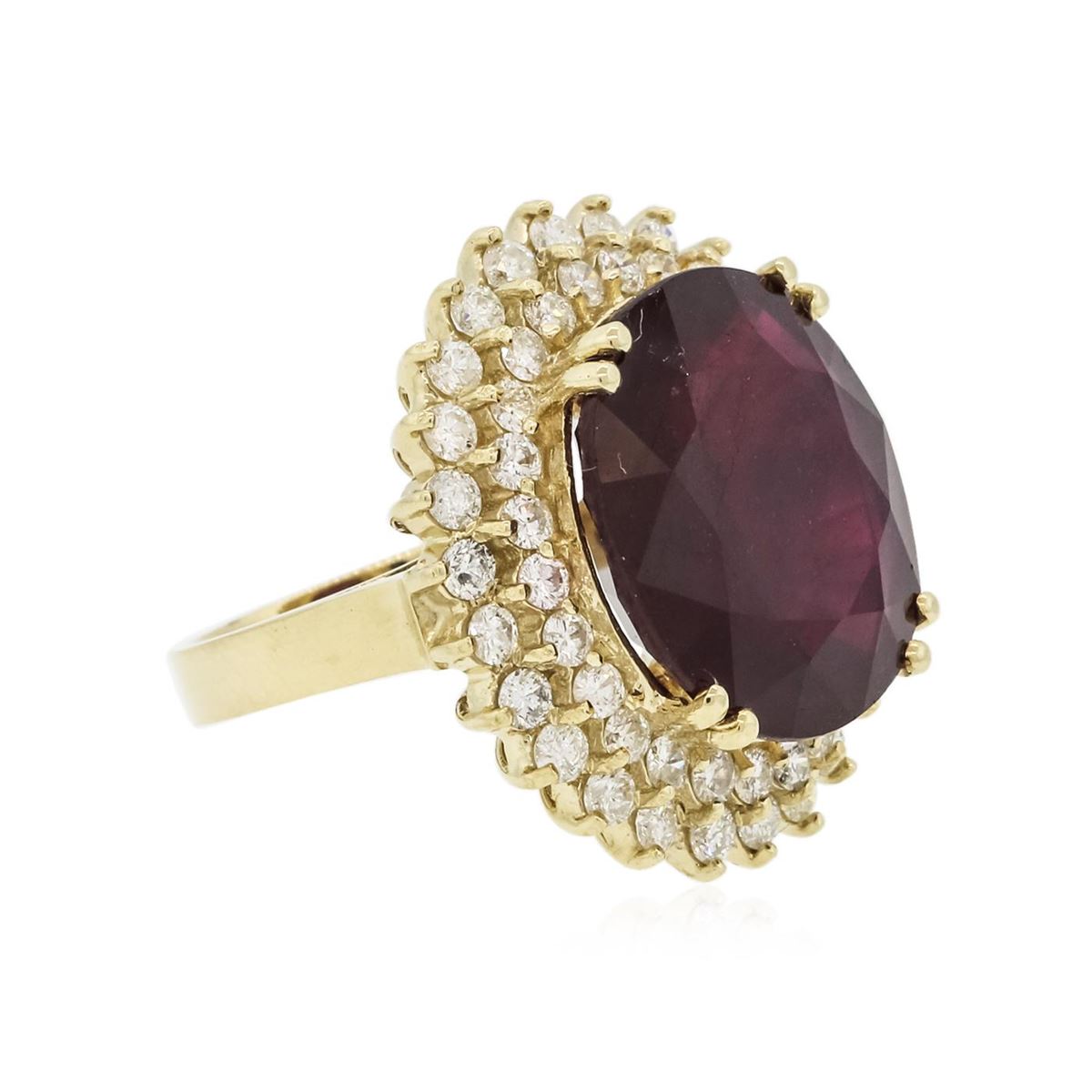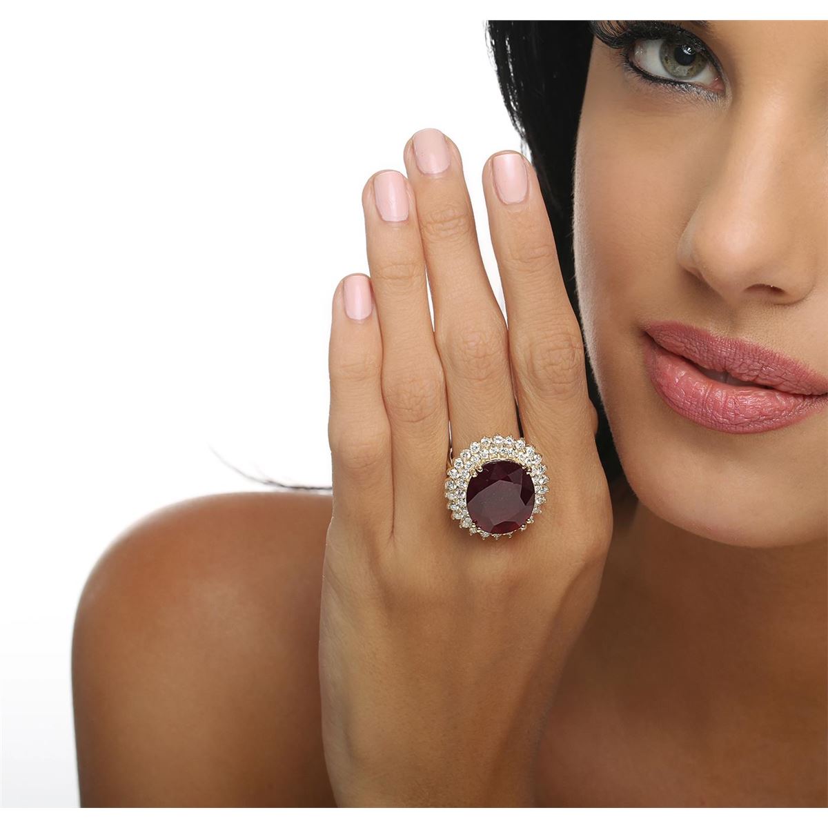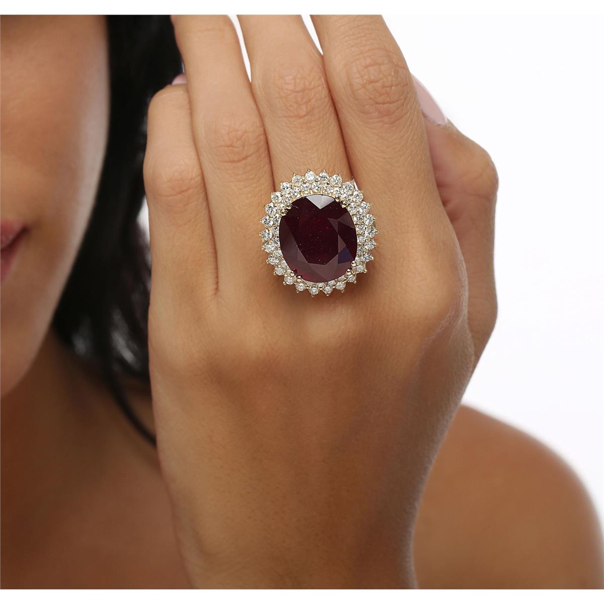 One electronically tested 14KT yellow gold ladies combination cast & assembled ring with a bright polish finish. Condition is new. Identified with markings of "K14". Containing: One prong set oval modified brilliant cut natural ruby, measuring 18.37 x 15.71 x 7.73mm, approximate weight of 17.96ct., clarity is heavily included, type II, dark, moderately strong, strongly purplish red color, (GIA stpR 7/4), cut is good. Twenty-Six prong set round brilliant cut diamonds, measuring 2.20 - 2.20 x 1.32mm (depth est.) approximate. Total Weight of 26 Stones = 1.01ct. Clarity: SI-2 to I-1. Color: K - L, Cut is Good. Twenty-Six prong set round brilliant cut diamonds, measuring 2.00 - 2.00 x 1.20mm (depth est.) approximate. Total Weight of 26 Stones = 0.76ct. Clarity: SI-2 to I-1. Color: K - L, Cut is Good. Colored gemstones are presumed to have been subjected to commonly used enhancement processes. All diamonds and colored gemstones are graded in the mounting, unless otherwise stated. Total Weight of Colored Stones 17.96ct. Total Weight of Diamonds 1.77ct. Total Weight of Ring 14.80 grams. GGL Appraised at $13,735.00.