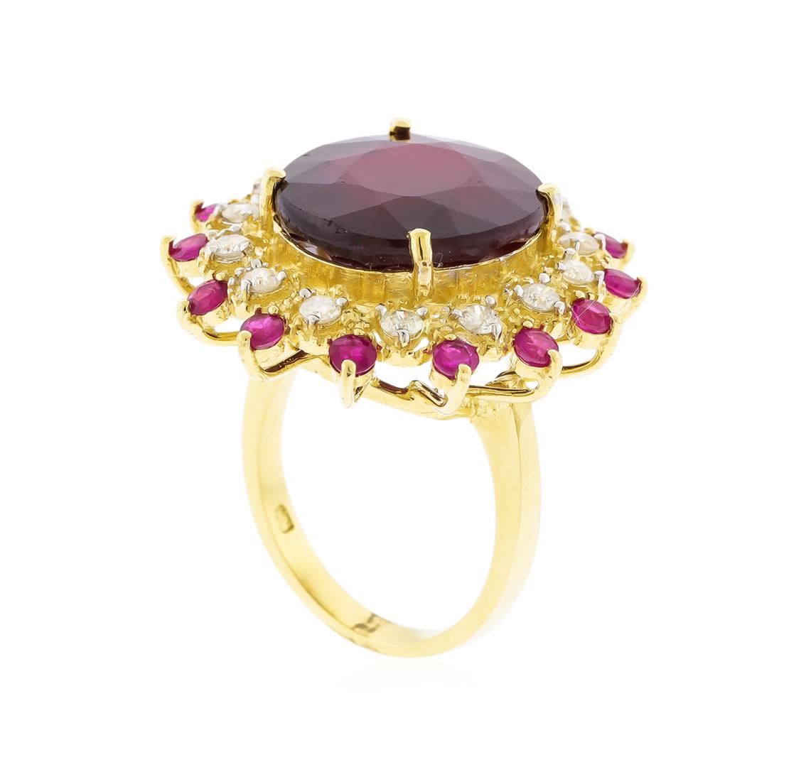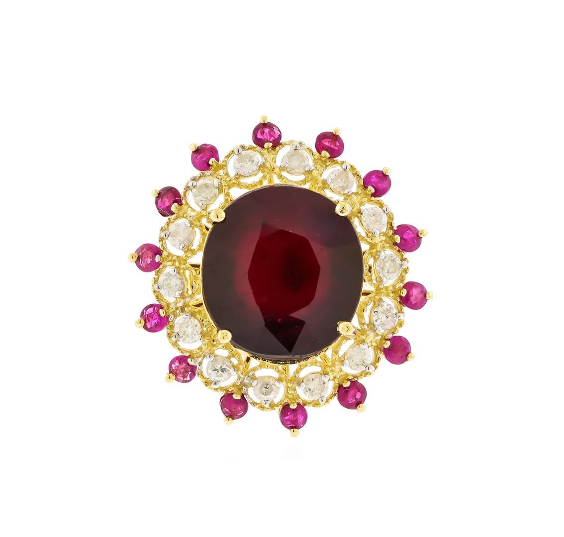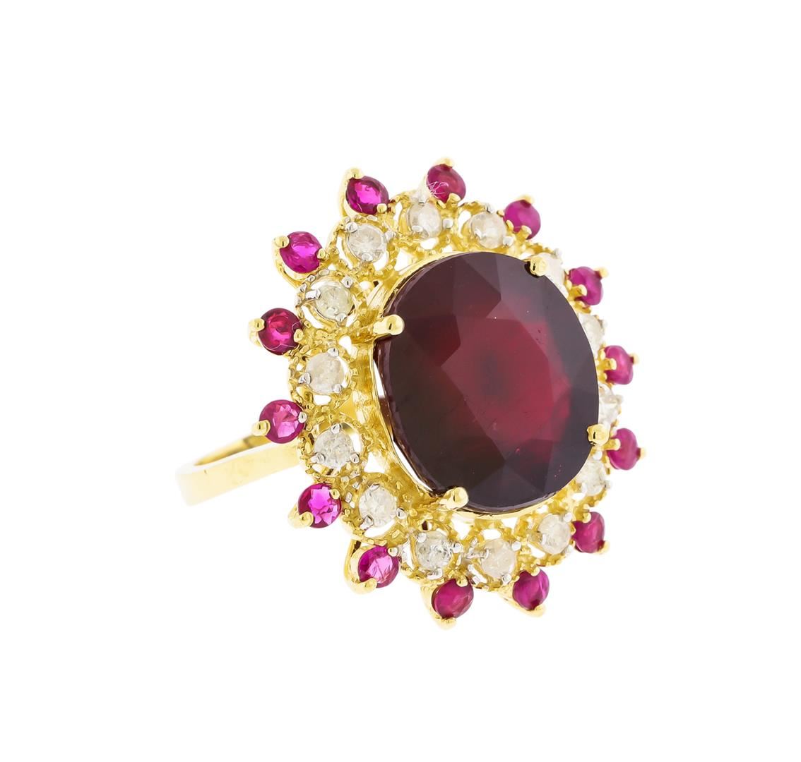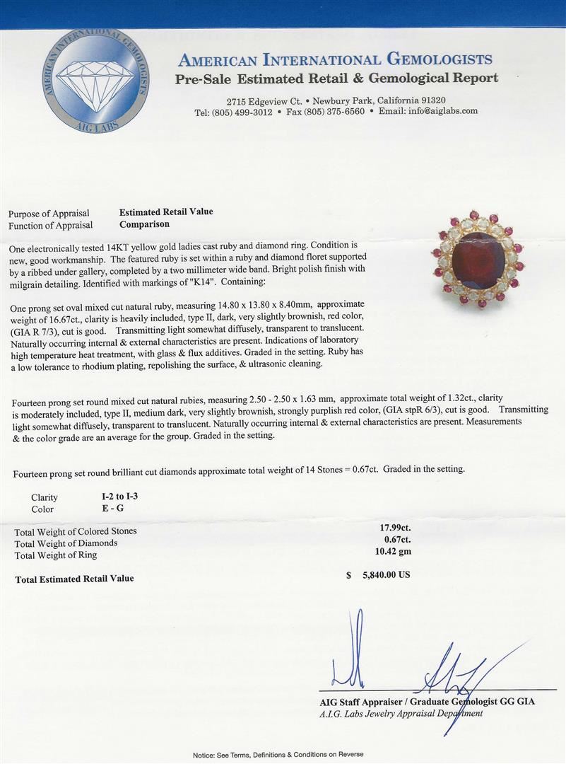 One electronically tested 14KT yellow gold ladies cast ruby and diamond ring. The featured ruby is set within a ruby and diamond floret supported by a ribbed under gallery, completed by a two millimeter wide band. Bright polish finish with milgrain detailing. Identified with markings of "K14". Condition is new, good workmanship. Containing: One prong set oval mixed cut natural ruby, measuring 14.80 x 13.80 x 8.40mm, approximate weight of 16.67ct., clarity is heavily included, type II, dark, very slightly brownish, red color, (GIA R 7/3), cut is good. Transmitting light somewhat diffusely, transparent to translucent. Naturally occurring internal & external characteristics are present. Indications of laboratory high temperature heat treatment, with glass & flux additives. Graded in the setting. Ruby has a low tolerance to rhodium plating, repolishing the surface, & ultrasonic cleaning.Fourteen prong set round mixed cut natural rubies, measuring 2.50 - 2.50 x 1.63 mm, approximate total weight of 1.32ct., clarity is moderately included, type II, medium dark, very slightly brownish, strongly purplish red color, (GIA stpR 6/3), cut is good. Transmitting light somewhat diffusely, transparent to translucent. Naturally occurring internal & external characteristics are present. Measurements & the color grade are an average for the group. Graded in the setting.Fourteen prong set round brilliant cut diamonds approximate total weight of 14 Stones = 0.67ct. Graded in the setting. Clarity: I-2 to I-3. Color: E - G. Total Weight of Colored Stones 17.99ct. Total Weight of Diamonds 0.67ct. Total Weight of Ring 10.42gm. AIG Appraised at $5,840.00.