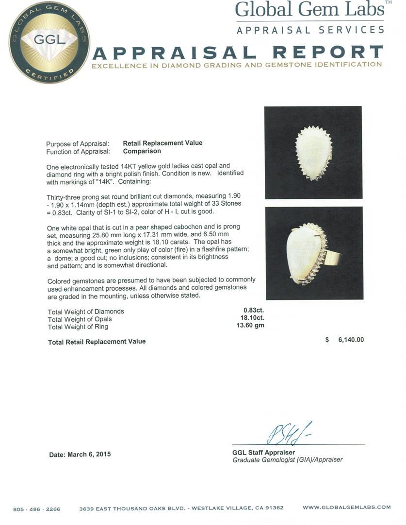 One electronically tested 14KT yellow gold ladies cast opal and diamond ring with a bright polish finish. Identified with markings of "14K". Condition is new. Containing: Thirty-Three prong set round brilliant cut diamonds, measuring 1.90 - 1.90 x 1.14mm (depth est.) approximate total weight of 33 Stones = 0.83ct.. Clarity: SI-1 to SI-2. Color: H - I, Cut is Good. One white opal that is cut in a pear shaped cabochon and is prong set, measuring 25.80 mm long x 17.31 mm wide, and 6.50 mm thick and the approximate weight is 18.10 carats. The opal has a somewhat bright, green only play of color (fire) in a flashfire pattern; a dome; a good cut; no inclusions; consistent in its brightness and pattern; and is somewhat directional. Colored gemstones are presumed to have been subjected to commonly used enhancement processes. All diamonds and colored gemstones are graded in the mounting, unless otherwise stated.. Total Weight of Diamonds 0.83ct.. Total Weight of Opals 18.10 ct.. Total Weight of Ring 13.60 grams. GGL Appraised.