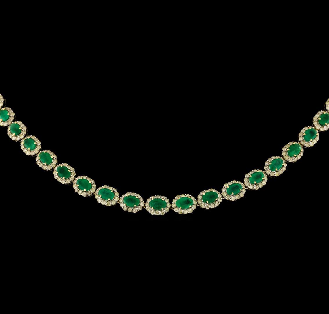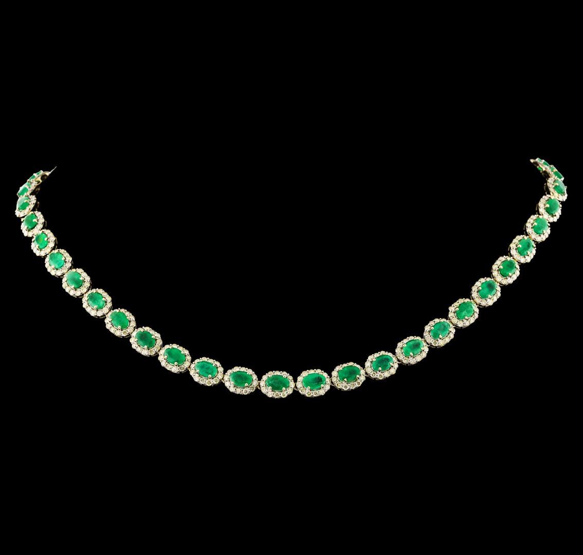 One electronically tested 14KT yellow gold ladies cast & assembled emerald and diamond necklace. Seventeen inch length necklace features a flexible emerald and diamond bezel ribbon, terminating in a concealed clasp with twin safeties. Bright polish finish with rhodium accents. Trademark is Orianne. Identified with markings of "14K". Condition is new, good workmanship. Containing: Forty-four prong set oval mixed cut natural emeralds approximate total weight of 18.13ct., clarity is heavily included, type III, medium dark, very slightly grayish, very slightly bluish green color, (GIA vslbG 6/3), cut is good. Transmitting light somewhat diffusely, transparent to translucent. Naturally occurring internal & external characteristics are present. Color grade is an average for the group. Indications of oil residue. Graded in the setting. Five Hundred Twenty-Eight prong set round brilliant cut diamonds approximate total weight of 528 Stones = 10.28ct. The group is composed of a mix of natural faint yellow and very light yellow color diamonds. Graded in the setting. Clarity: I-2 to I-3. Total Weight of Colored Stones 18.13ct. Total Weight of Diamonds 10.28ct. Total Weight of Necklace 31.40gm. AIG Appraised at $27,750.00.