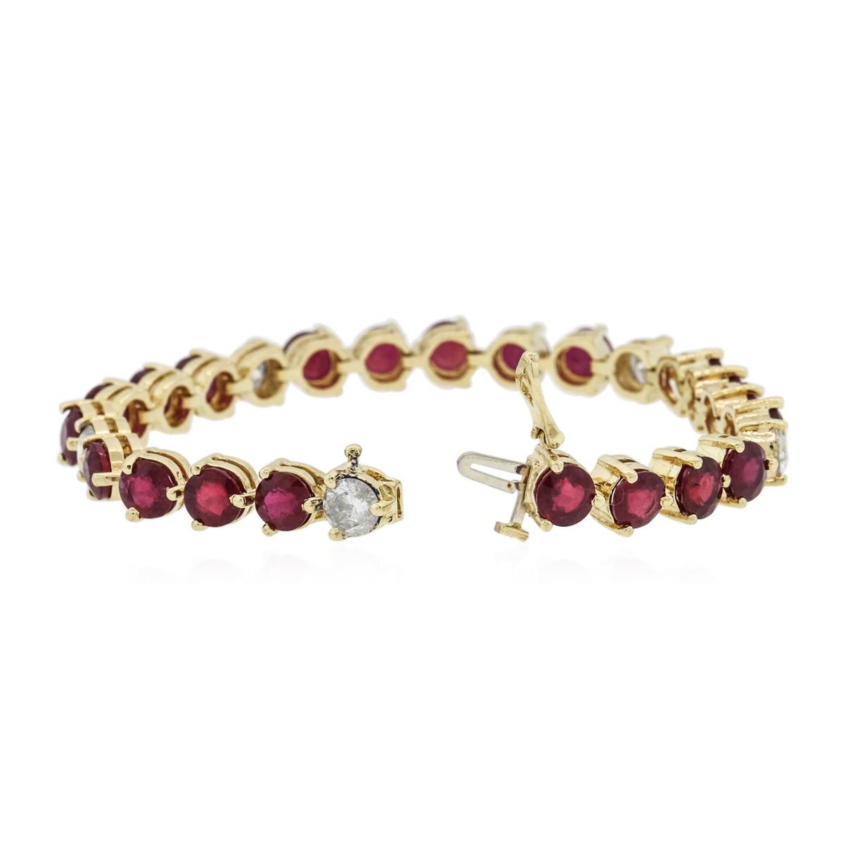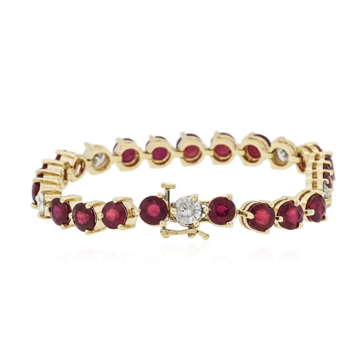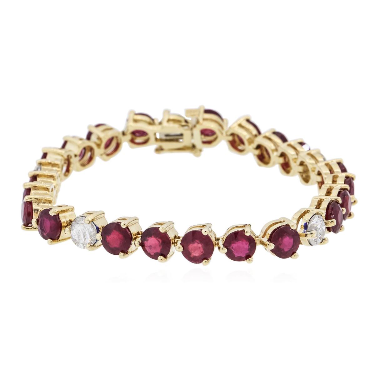 One electronically tested 14KT yellow gold ladies combination cast & assembled ruby and diamond bracelet with a hidden box clasp with a bright polish finish. Measurements: 7" in length. Identified with markings of "14K". Condition is new. Containing: Twenty-one prong set round modified brilliant cut natural rubies, measuring 5.46 - 5.43 x 3.65 mm, approximate total weight of 18.27ct., clarity is heavily included, type II, medium dark, moderately strong, red color, (GIA R 6/4), cut is good. Five prong set round brilliant cut diamonds, measuring 5.23 - 5.18 x 3.26mm (depth est.) approximate total weight of 5 Stones = 2.69ct. Clarity: I-2 to I-3. Color: I - J, Cut is Good. Colored gemstones are presumed to have been subjected to commonly used enhancement processes. All diamonds and colored gemstones are graded in the mounting, unless otherwise stated. Total Weight of Colored Stones 18.27ct. Total Weight of Diamonds 2.69ct. Total Weight of Bracelet 22.10 grams. GGL Appraised at $22,885.00.