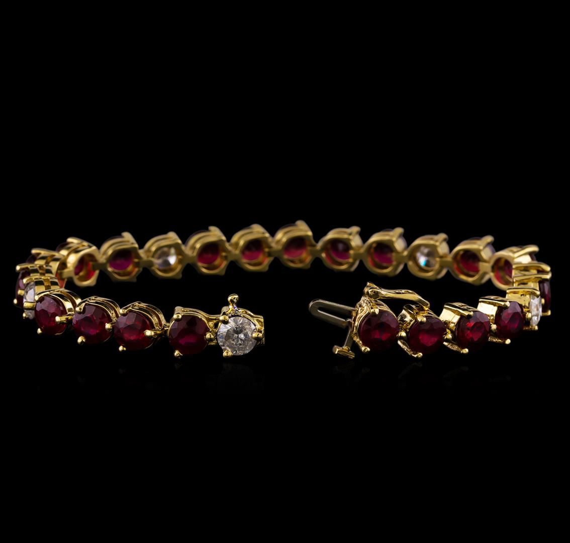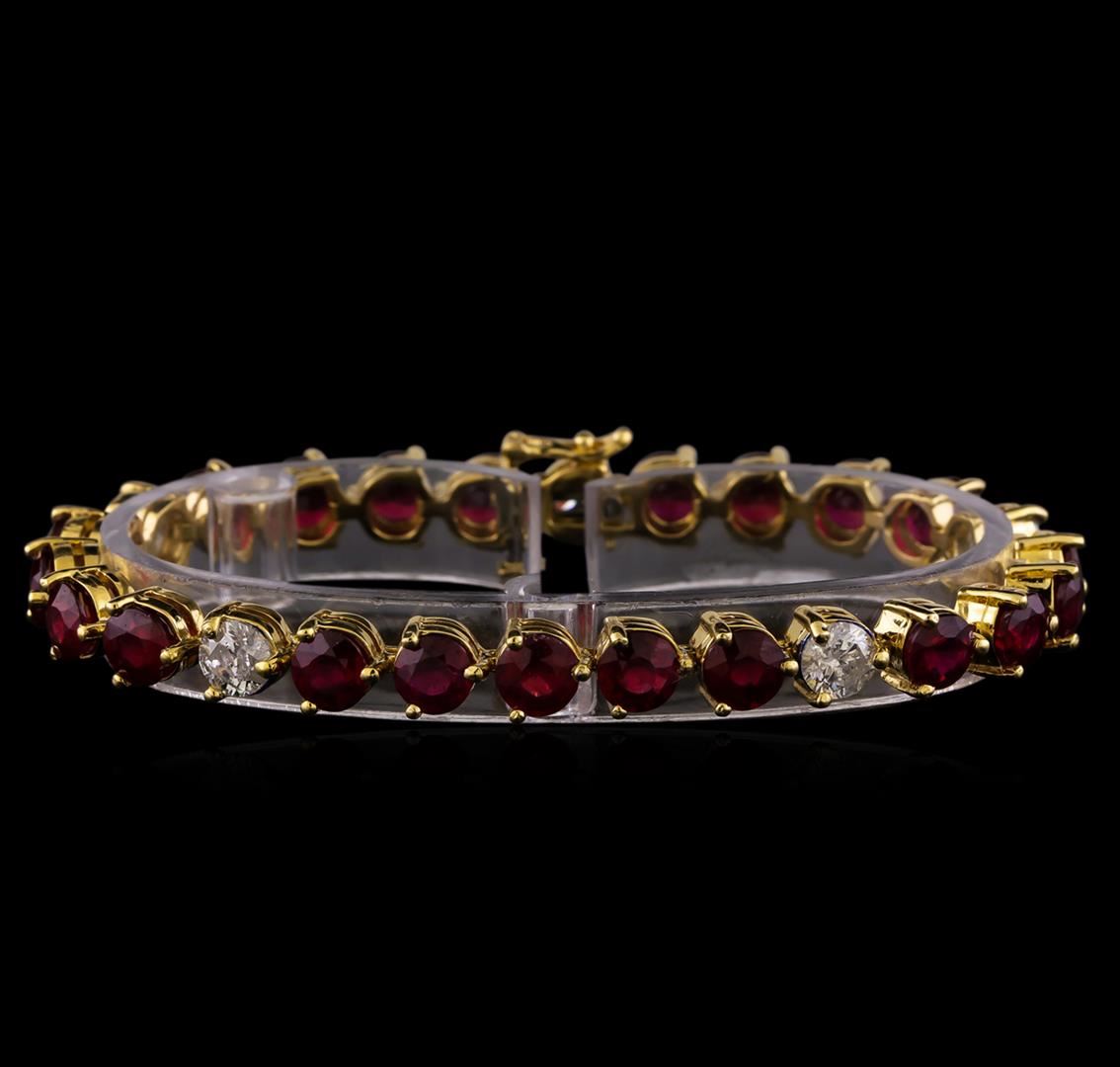 One electronically tested 14KT yellow gold ladies combination cast & assembled ruby and diamond bracelet with a hidden box clasp with a bright polish finish. Measurements: 7" in length. Identified with markings of "14K". Condition is new. Containing: Twenty-one prong set round modified brilliant cut natural rubies, measuring 5.46 - 5.43 x 3.65 mm, approximate total weight of 18.27ct., clarity is heavily included, type II, medium dark, moderately strong, red color, (GIA R 6/4), cut is good. Five prong set round brilliant cut diamonds, measuring 5.23 - 5.18 x 3.26mm (depth est.) approximate total weight of 5 Stones = 2.69ct. Clarity: I-2 to I-3. Color: I - J, Cut is Good. Colored gemstones are presumed to have been subjected to commonly used enhancement processes. All diamonds and colored gemstones are graded in the mounting, unless otherwise stated. Total Weight of Colored Stones 18.27ct. Total Weight of Diamonds 2.69ct. Total Weight of Bracelet 22.10 grams. GGL Appraised at $22,885.00.