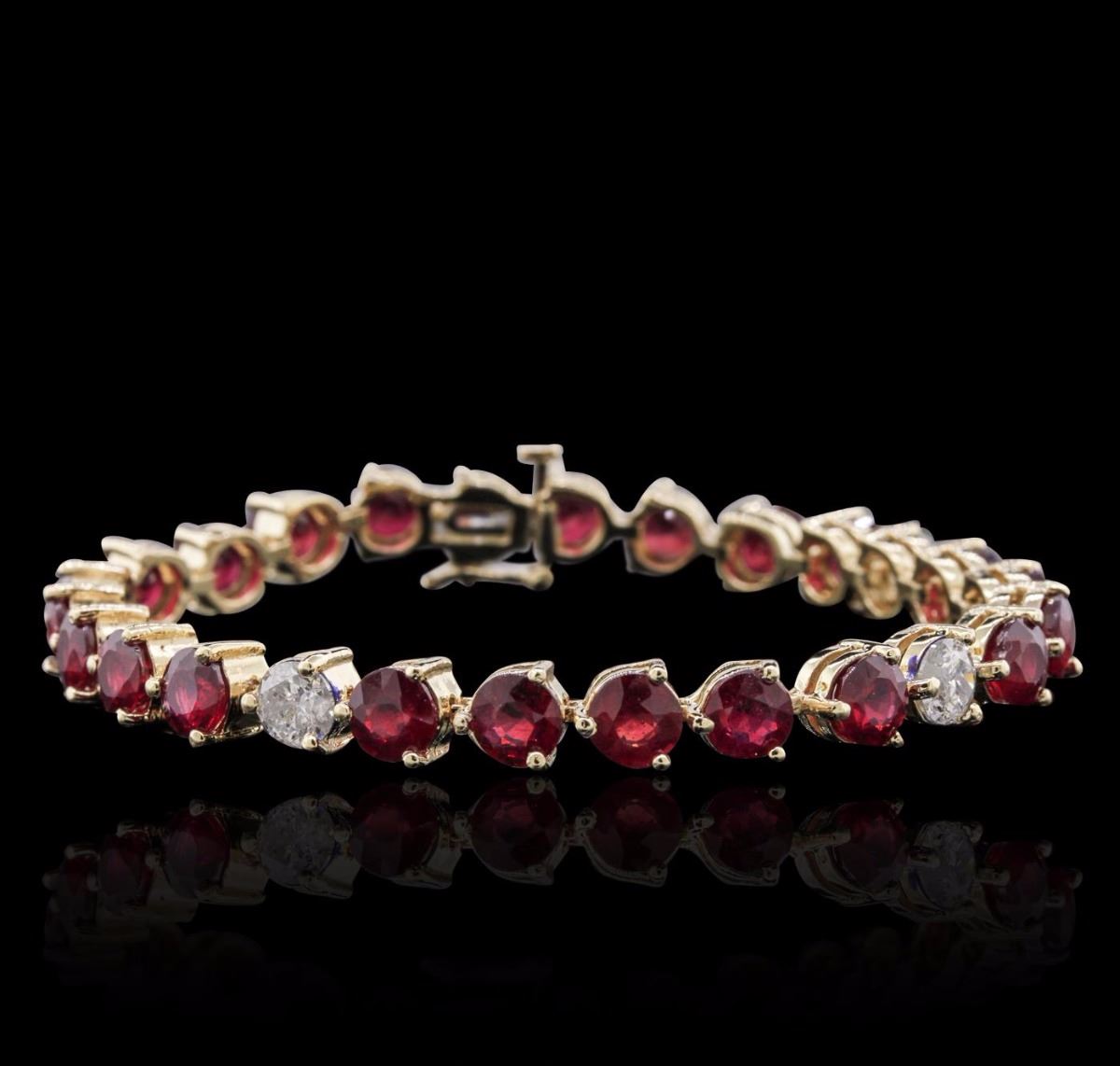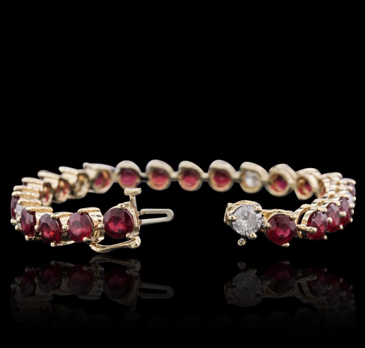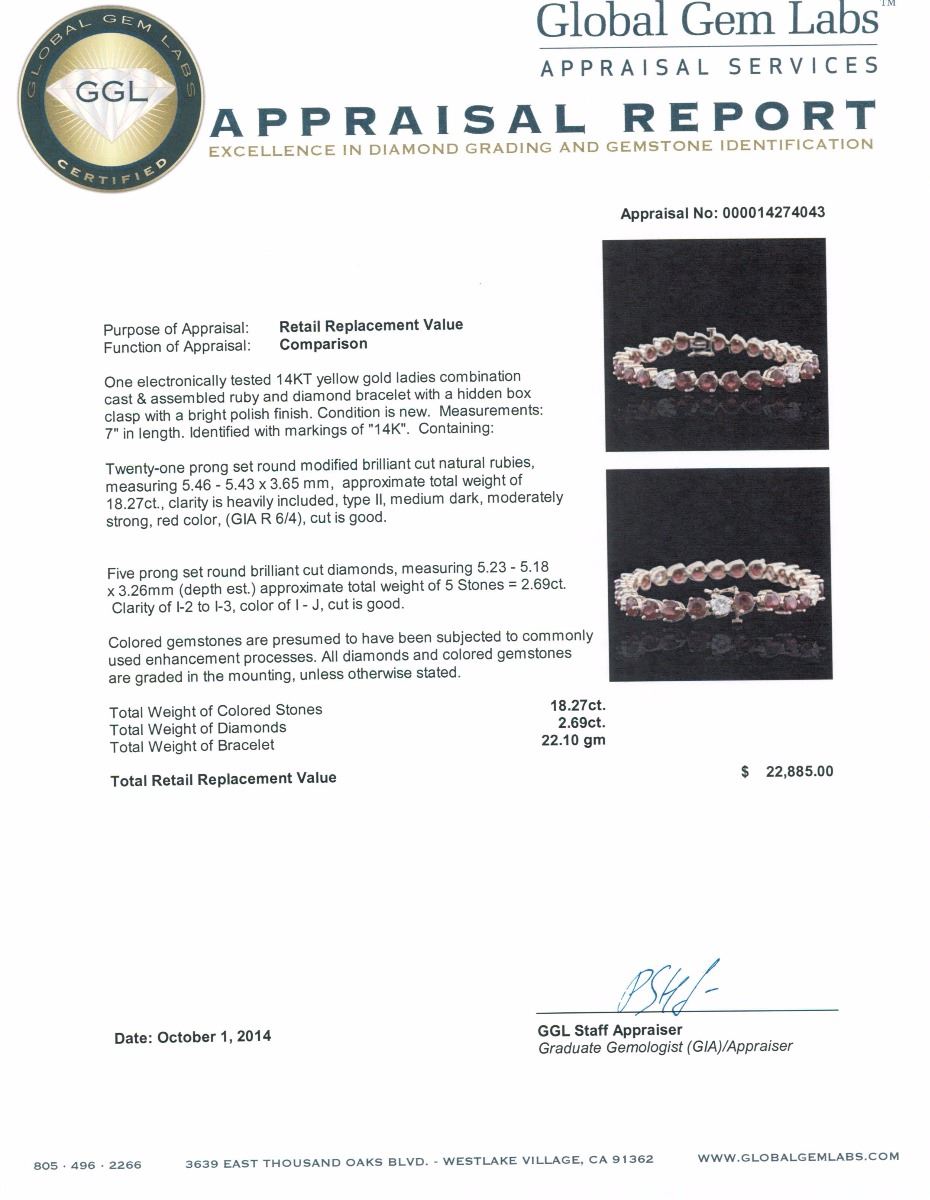 One electronically tested 14KT yellow gold ladies combination cast & assembled ruby and diamond bracelet with a hidden box clasp with a bright polish finish. Measurements: 7" in length. Identified with markings of "14K". Condition is new. Containing: Twenty-one prong set round modified brilliant cut natural rubies, measuring 5.46 - 5.43 x 3.65 mm, approximate total weight of 18.27ct., clarity is heavily included, type II, medium dark, moderately strong, red color, (GIA R 6/4), cut is good. Five prong set round brilliant cut diamonds, measuring 5.23 - 5.18 x 3.26mm (depth est.) approximate total weight of 5 Stones = 2.69ct. Clarity: I-2 to I-3. Color: I - J, Cut is Good. Colored gemstones are presumed to have been subjected to commonly used enhancement processes. All diamonds and colored gemstones are graded in the mounting, unless otherwise stated. Total Weight of Colored Stones 18.27ct. Total Weight of Diamonds 2.69ct. Total Weight of Bracelet 22.10 grams. GGL Appraised at $22,885.00.