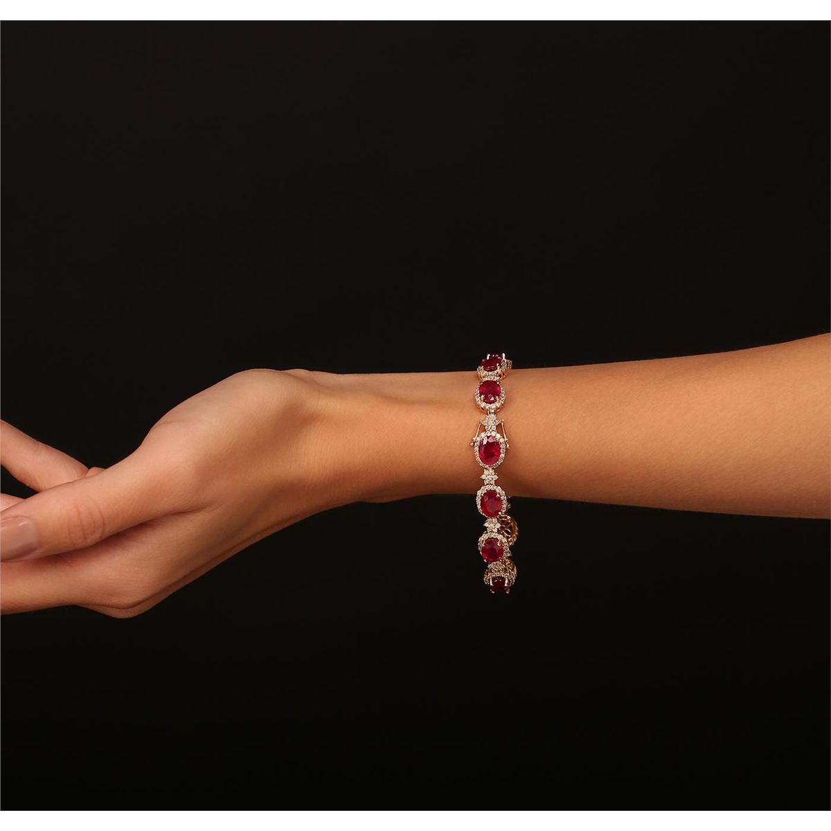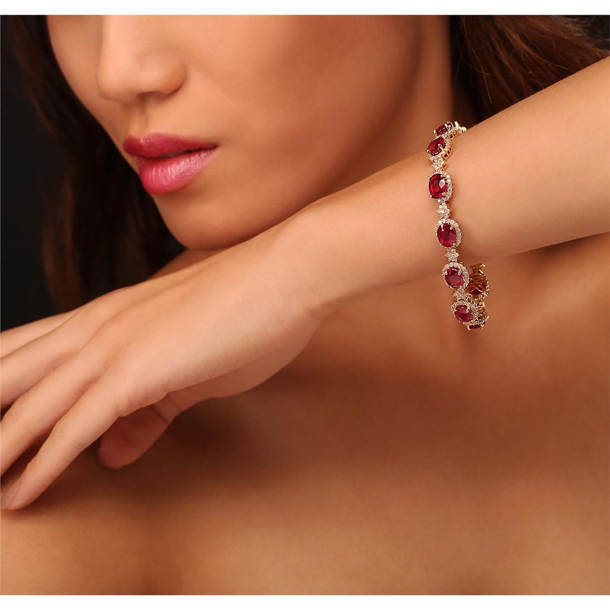 One electronically tested 14KT yellow gold Ladies combination cast & assembled bracelet with a hidden box clasp with a bright polish finish. Condition is new. Measurements: 7" in length. Identified with markings of "14K". Containing: Twelve prong set oval modified brilliant cut natural rubies, measuring 7.90 x 6.04 x 3.93mm, approximate. Total Weight of 18.36ct., clarity is heavily included, type II, medium, moderately strong, strongly purplish red color, (GIA stpR 5/4), cut is good. Colored gemstones are presumed to have been subjected to commonly used color/clarity enhancement processes. Three Hundred prong set round brilliant cut diamonds, measuring 1.50 - 1.50 x 0.90mm (depth est.) approximate. Total Weight of 300 Stones = 3.69ct. Clarity: I-1 to I-2. Color: J - K, Cut is Good. Total Weight of Colored Stones 18.36ct. Total Weight of Diamonds 3.69ct. Total Weight of Bracelet 18.70 Grams. GGL Appraised at $38,155.00.