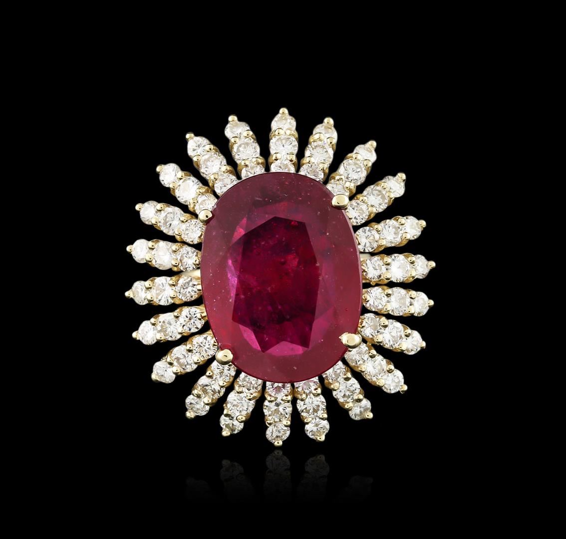 One electronically tested 14KT yellow gold ladies cast ruby and diamond ring with a bright polish finish. Identified with markings of "K14". Condition is new. Containing: One prong set oval modified brilliant cut natural ruby, measuring 18.16 x 13.83 x 9.06mm, approximate weight of 19.11ct., clarity is heavily included, type II, medium dark, very slightly brownish, strongly purplish red color, (GIA stpR 6/3), cut is good. Sixty-Six prong set round brilliant cut diamonds, measuring 2.40 - 1.90 x 1.29mm (depth est.) approximate total weight of 66 Stones = 2.40ct. Clarity: VS-2 to SI-1. Color: I - J, Cut is Good. Diamonds and colored gemstones are graded in the mounting, unless otherwise stated. Colored gemstones are presumed to have been subjected to commonly used enhancement processes. Total Weight of Colored Stones 19.11ct. Total Weight of Diamonds 2.40ct. Total Weight of Ring 12.10 grams. GGL Appraised at $6,955.00.