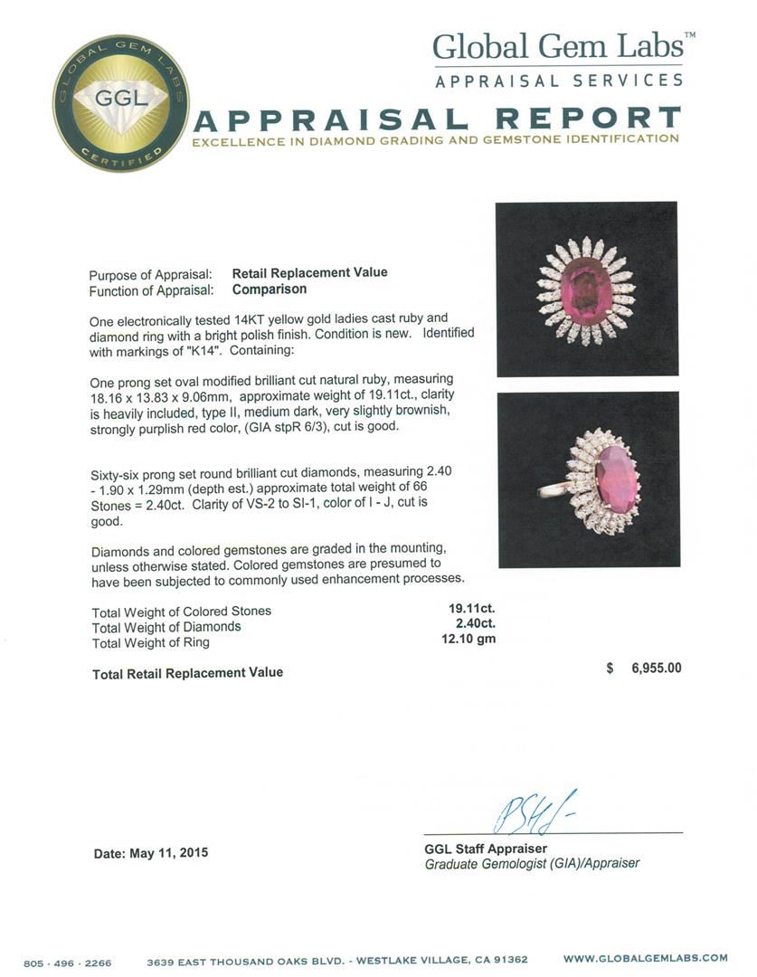 One electronically tested 14KT yellow gold ladies cast ruby and diamond ring with a bright polish finish. Identified with markings of "K14". Condition is new. Containing: One prong set oval modified brilliant cut natural ruby, measuring 18.16 x 13.83 x 9.06mm, approximate weight of 19.11ct., clarity is heavily included, type II, medium dark, very slightly brownish, strongly purplish red color, (GIA stpR 6/3), cut is good. Sixty-Six prong set round brilliant cut diamonds, measuring 2.40 - 1.90 x 1.29mm (depth est.) approximate total weight of 66 Stones = 2.40ct. Clarity: VS-2 to SI-1. Color: I - J, Cut is Good. Diamonds and colored gemstones are graded in the mounting, unless otherwise stated. Colored gemstones are presumed to have been subjected to commonly used enhancement processes. Total Weight of Colored Stones 19.11ct. Total Weight of Diamonds 2.40ct. Total Weight of Ring 12.10 grams. GGL Appraised at $6,955.00.
