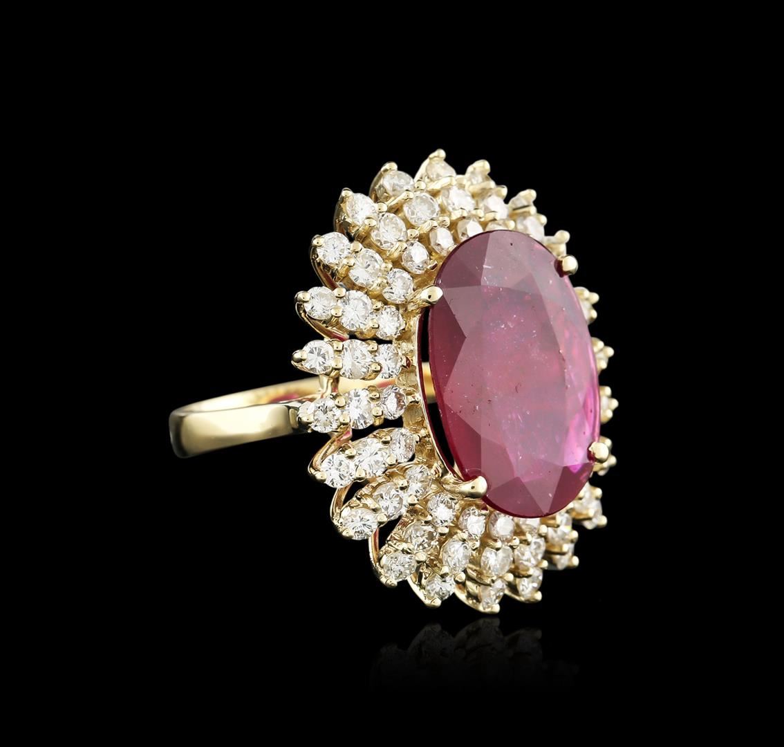 One electronically tested 14KT yellow gold ladies cast ruby and diamond ring with a bright polish finish. Identified with markings of "K14". Condition is new. Containing: One prong set oval modified brilliant cut natural ruby, measuring 18.16 x 13.83 x 9.06mm, approximate weight of 19.11ct., clarity is heavily included, type II, medium dark, very slightly brownish, strongly purplish red color, (GIA stpR 6/3), cut is good. Sixty-Six prong set round brilliant cut diamonds, measuring 2.40 - 1.90 x 1.29mm (depth est.) approximate total weight of 66 Stones = 2.40ct. Clarity: VS-2 to SI-1. Color: I - J, Cut is Good. Diamonds and colored gemstones are graded in the mounting, unless otherwise stated. Colored gemstones are presumed to have been subjected to commonly used enhancement processes. Total Weight of Colored Stones 19.11ct. Total Weight of Diamonds 2.40ct. Total Weight of Ring 12.10 grams. GGL Appraised at $6,955.00.
